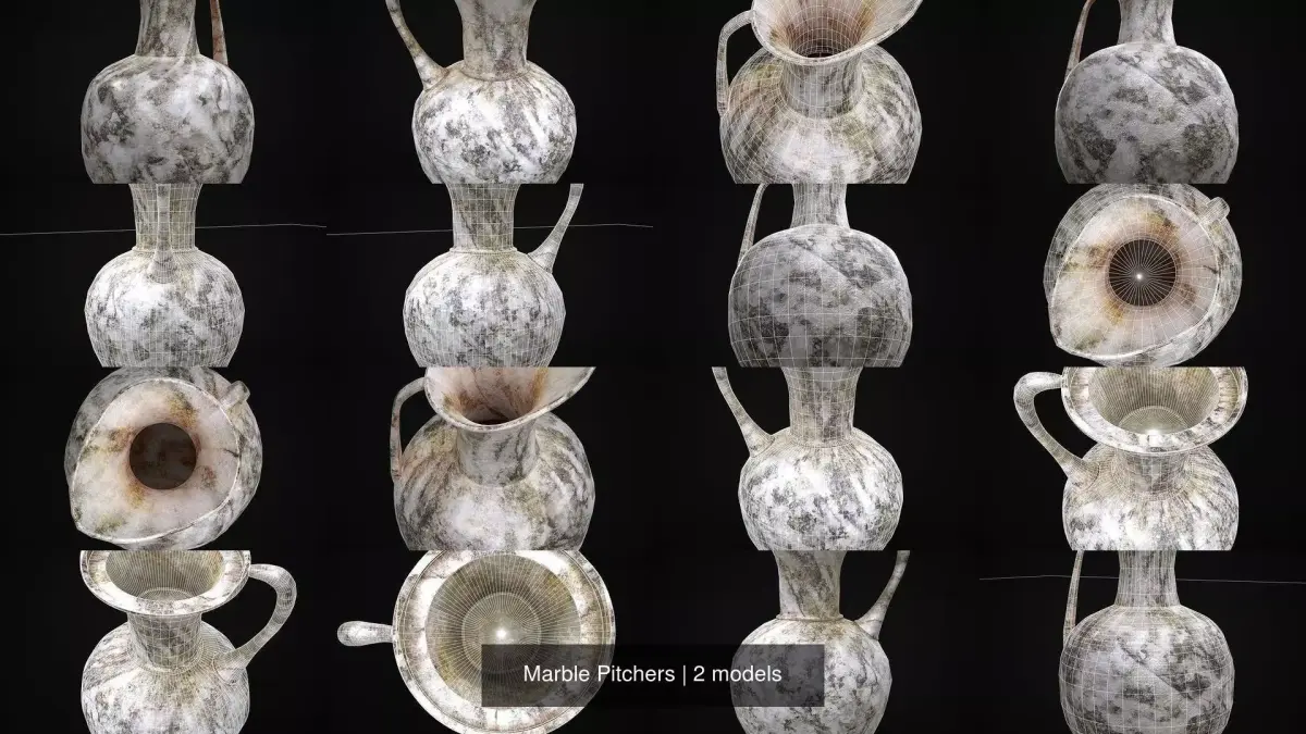 Marble Pitchers - 3D Model Files Include FBX and OBJ. Includes PBR Texture in 4096 x 4096. - Maps include : Basecolor, Normal, Roughness, Height and Metallic. Detail Normals included. All Preview renders were done Marmoset Toolbag 4. Scaled to real world scale. Customer Service Guaranteed. From the Creators at Get Dead Entertainment. Please like and Rate! Follow us on FaceBook and Instagram to keep updated on all our newest models. Model can be used for any purpose except resale or redistribution of the asset if not used in a game, commercial or media project.