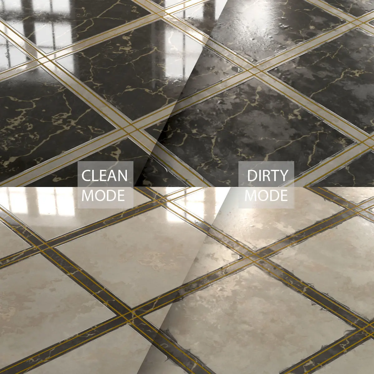 - In the Maps folder have two sets of materials, each set with 3 different modes, clean, dirty andcommon modes for each set of textures.