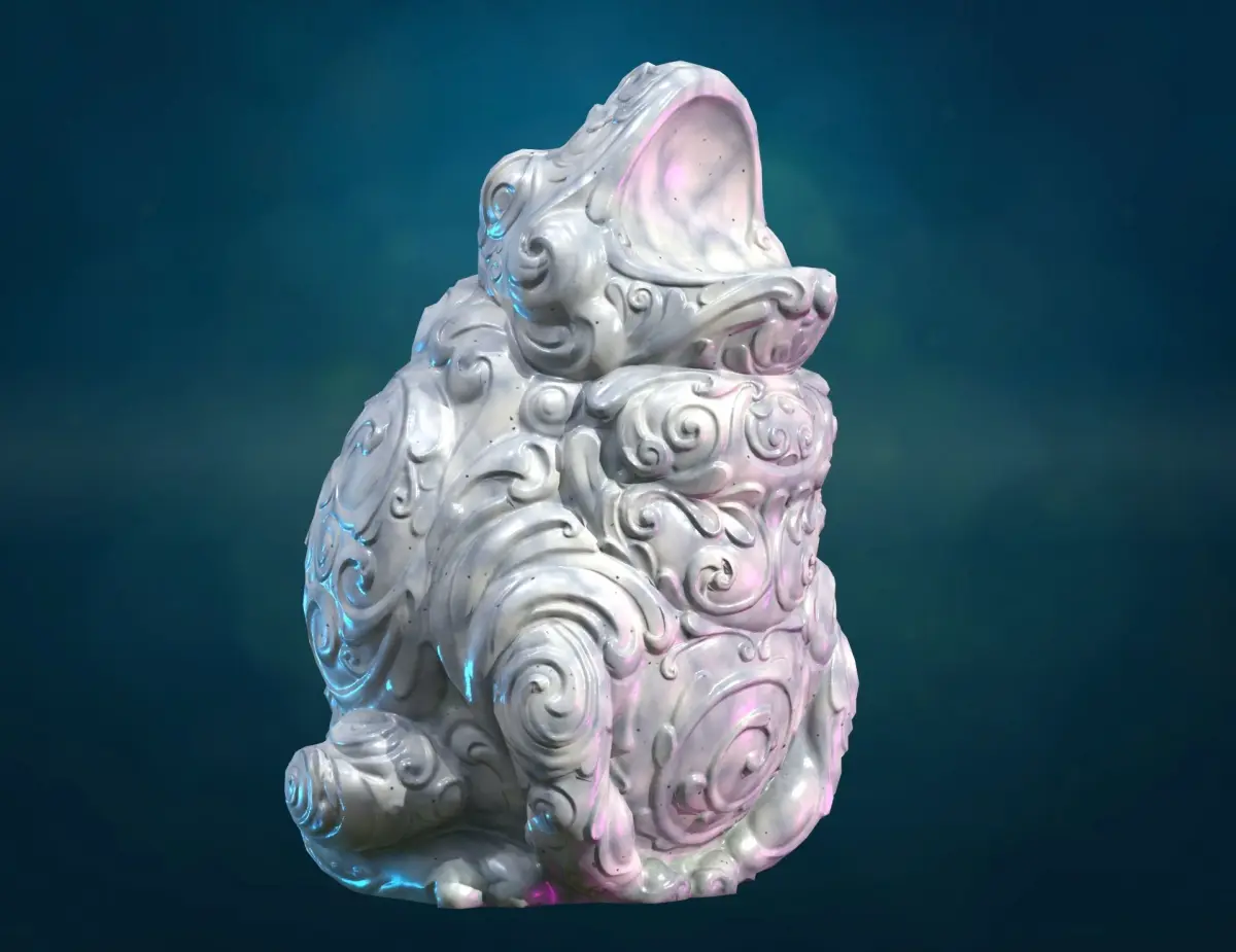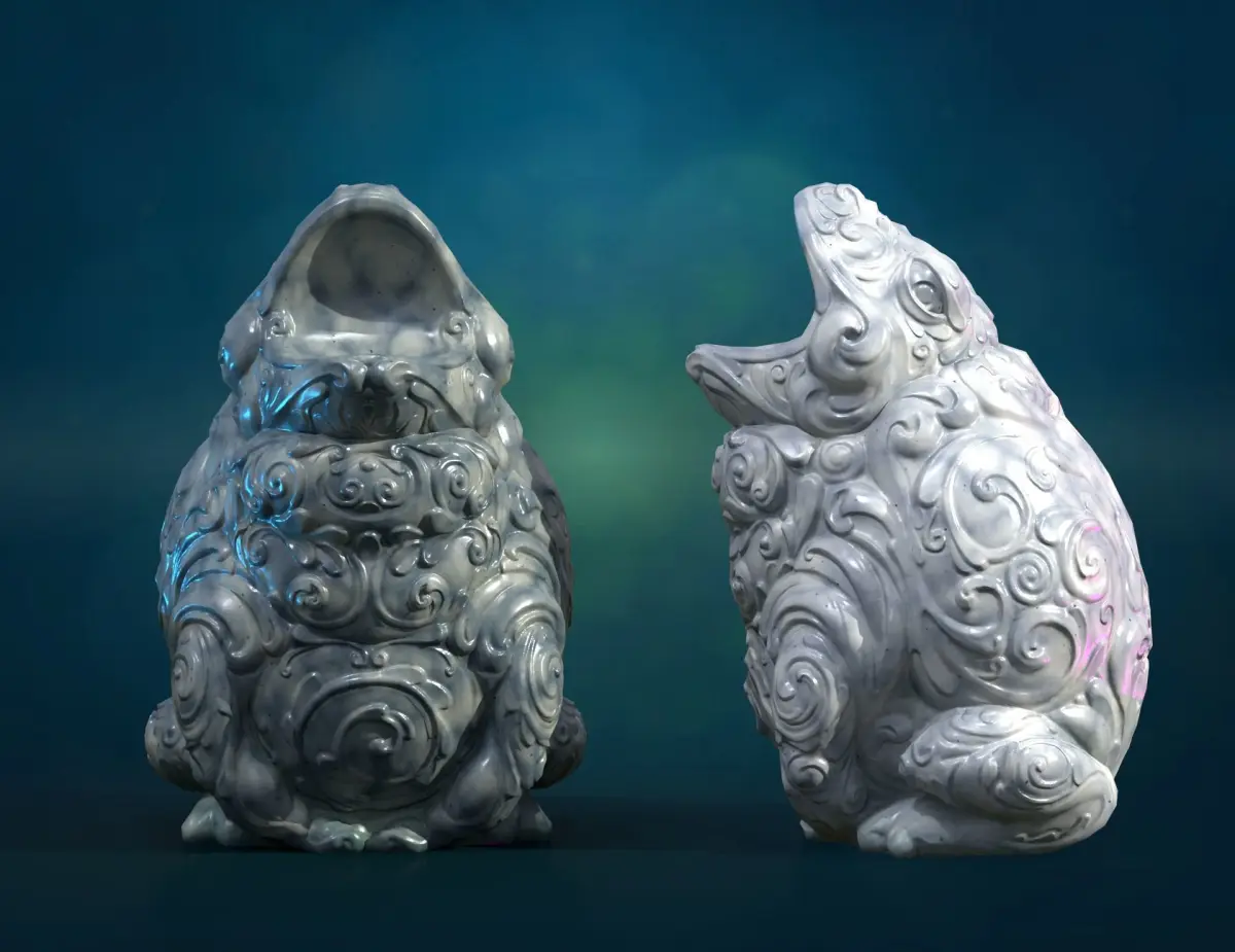 Ornate frog sculpture with opened mouth.