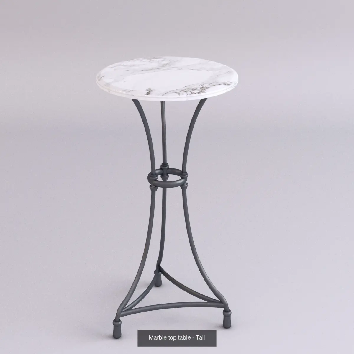 White marble top with edging, on a decorative iron base with 3 legs.3 different sizes - Medium (or standard), Small (narrower) and Tall (narrow and high)Each table's marble top has different edging, and tops can be swapped out.