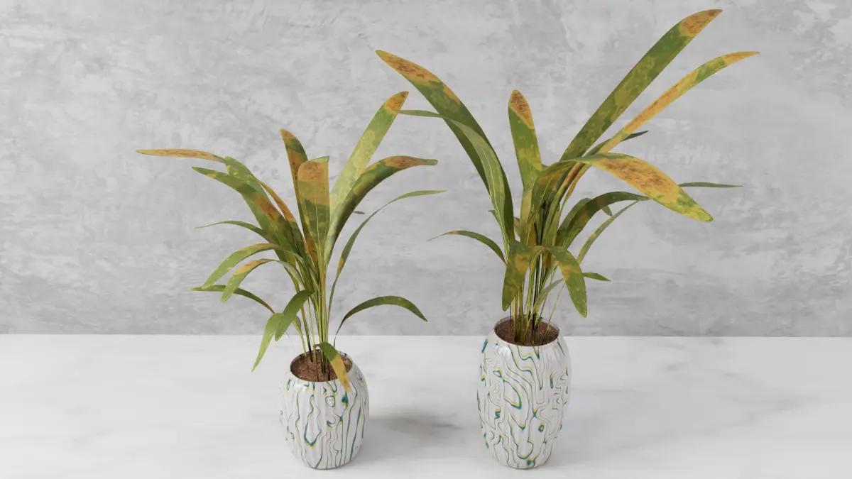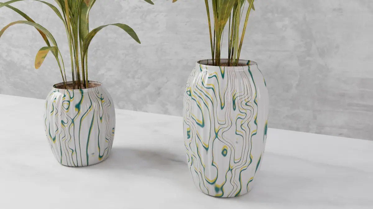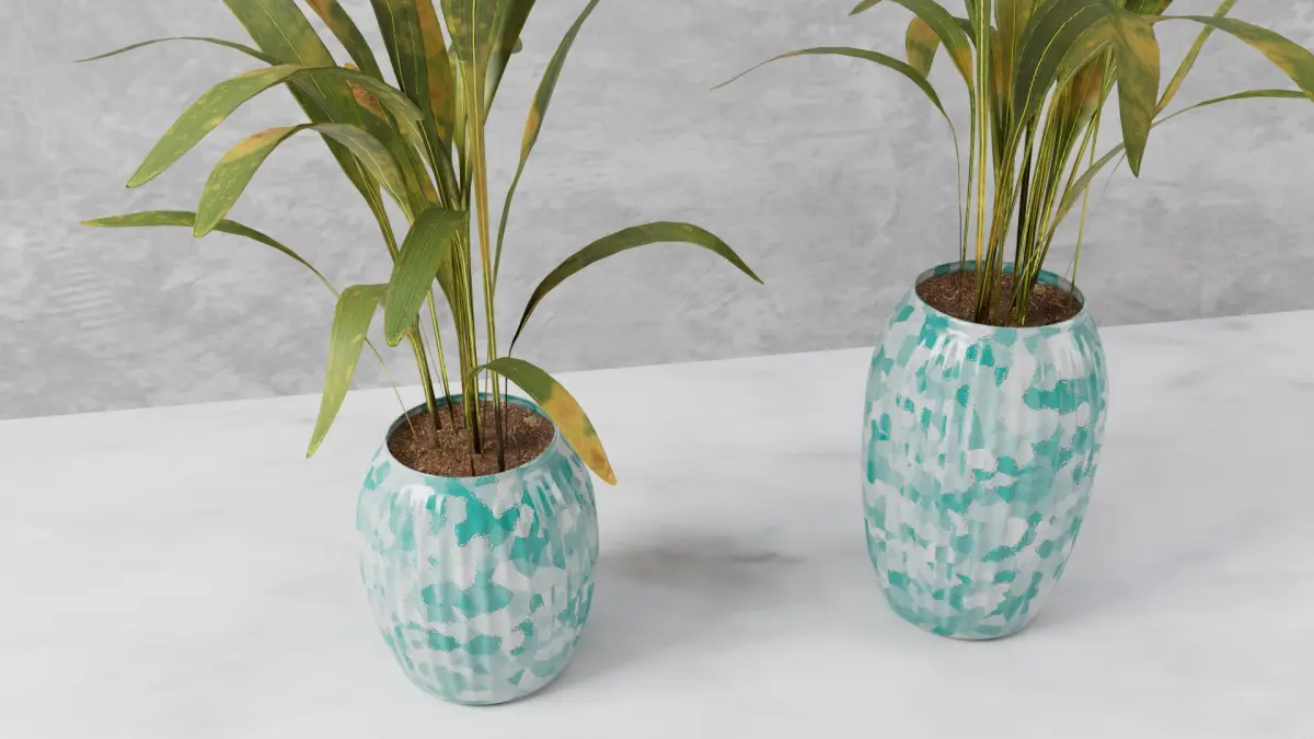 Hi, this is a beautiful Vase to use for products and interior scene setup having 2 types of design :One of Cell pattern Second is of abstract waves patternwhich give unique and modern style with its contrast I keep the palm leaf texture for draught condition to give a natural look of having different green, yellow and reddish pigment in leaves.