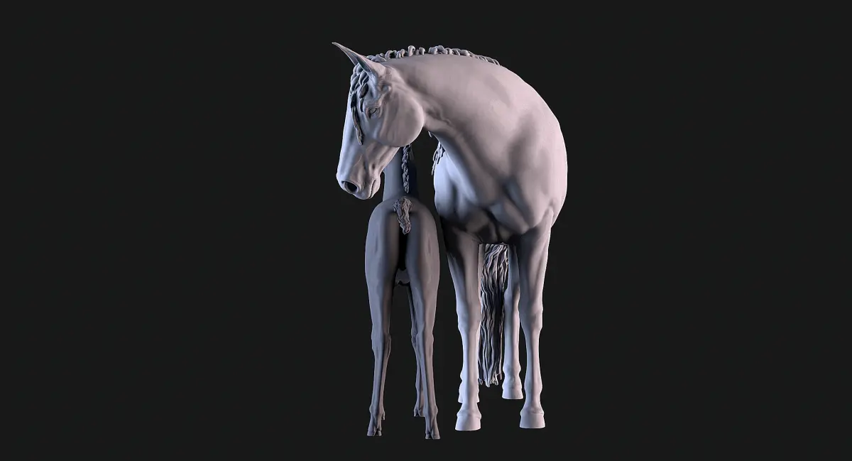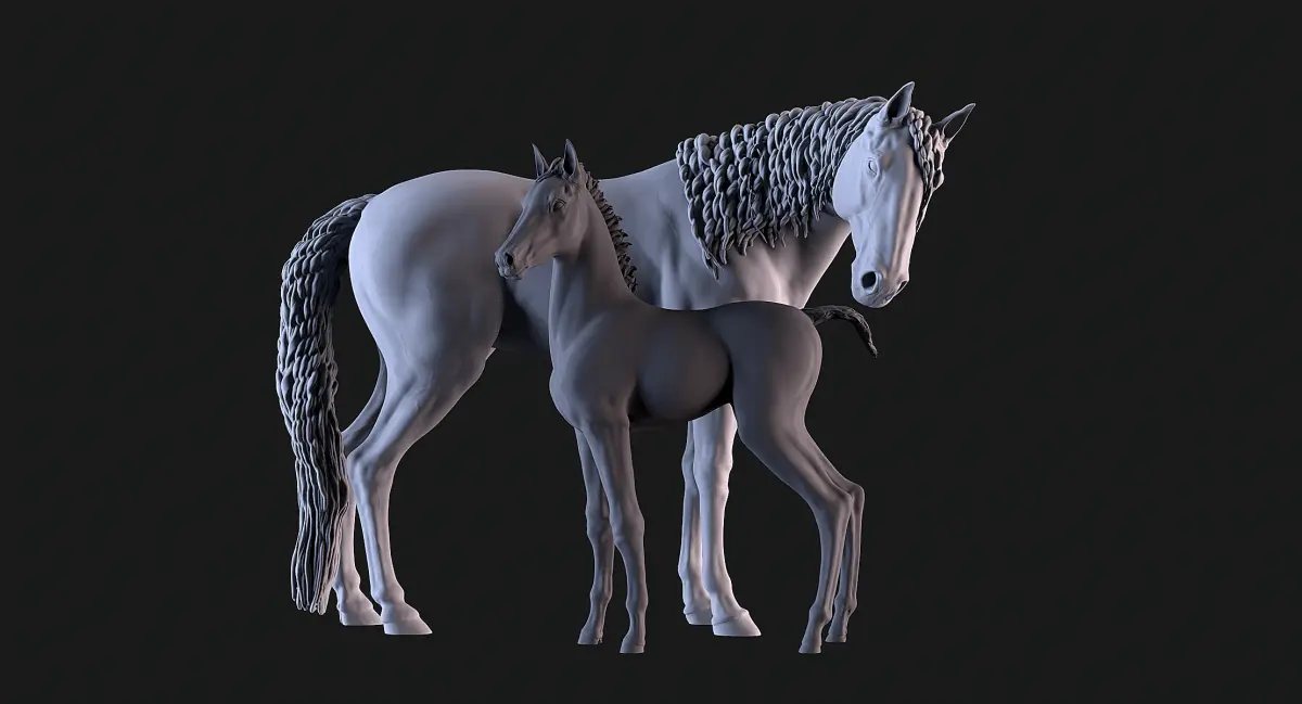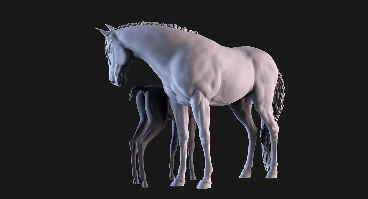 Celebrate the bond of nature with these high-quality sculptures of a mare and her foal, meticulously sculpted in ZBrush 2024.