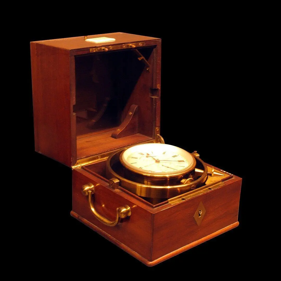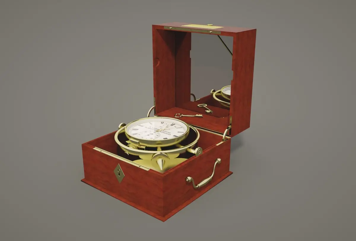 The chronometers that were used to determine geographical longitude are referred to as longitude clocks, marine chronometers, ship chronometers or ship clocks. The introduction of this instrument made it possible for the first time to determine longitude on the high seas with sufficient accuracy.The model was rendered using Twilight Render