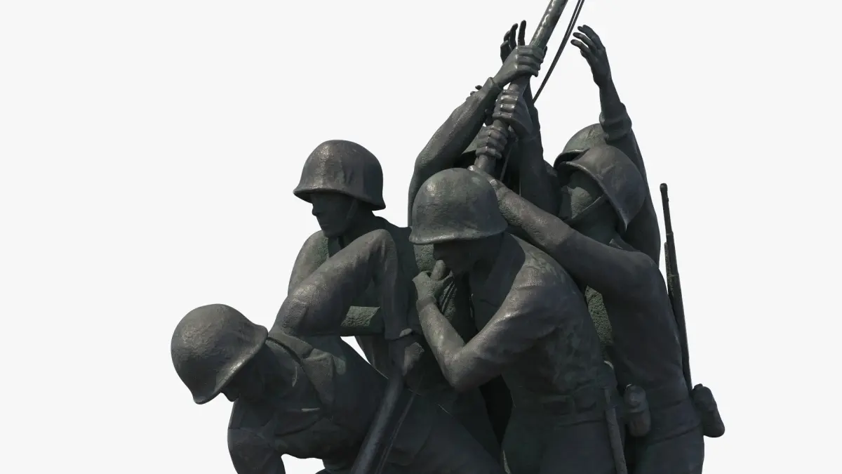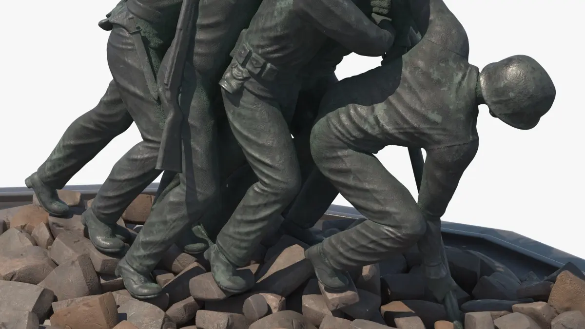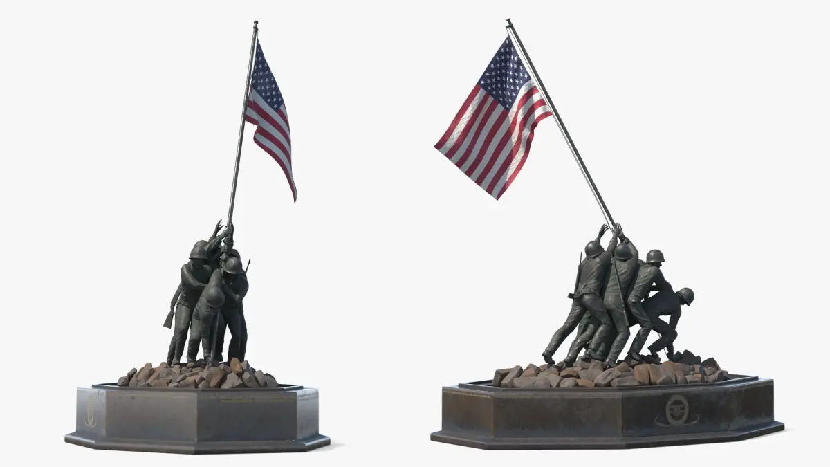 Marine Corps War Memorial Patinated Bronze is a 3d model of the iconic World War II scene depicting six U.S. Marines raising the American flag atop Mount Suribachi during the Battle of Iwo Jima.
