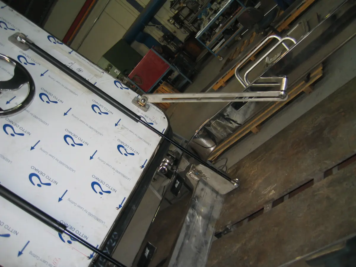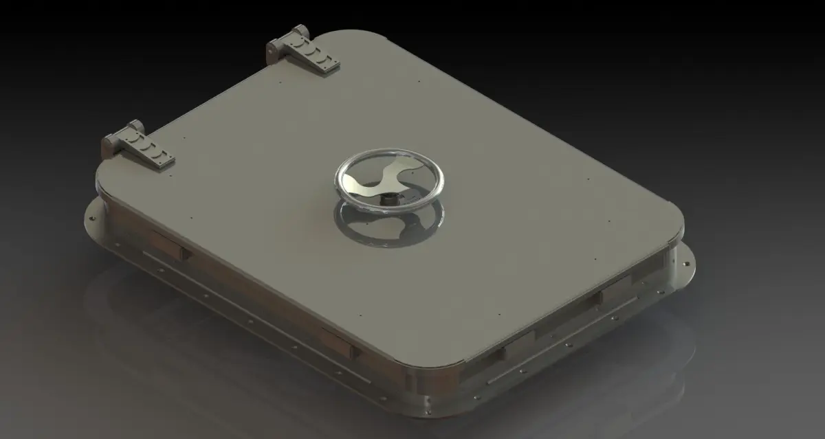 Marine hatch for a yacht.Center gear operated locking mechanism with cleats.Gas spring opened.Stopper for maintaining open position at 95 degrees.