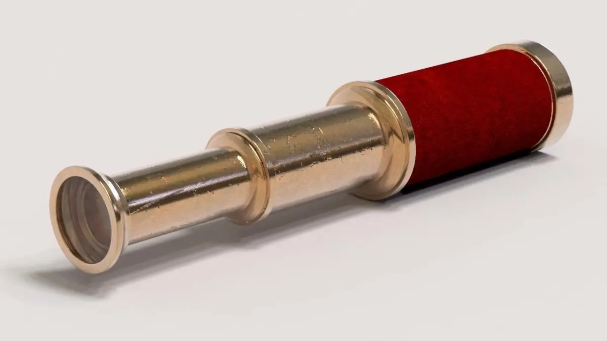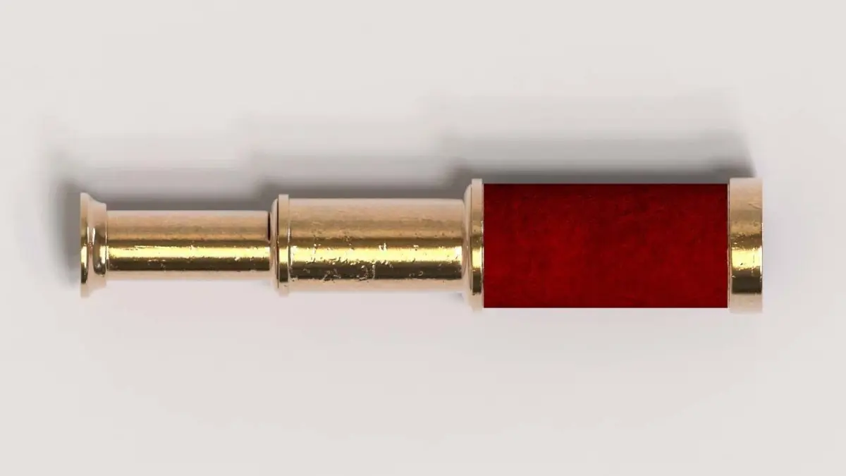 This model of a marine telescope has a brass body with a leather cover on the big part, glass in the front and in the back. There are bump maps of scratches to achieve a realistic look of an old used telescope.