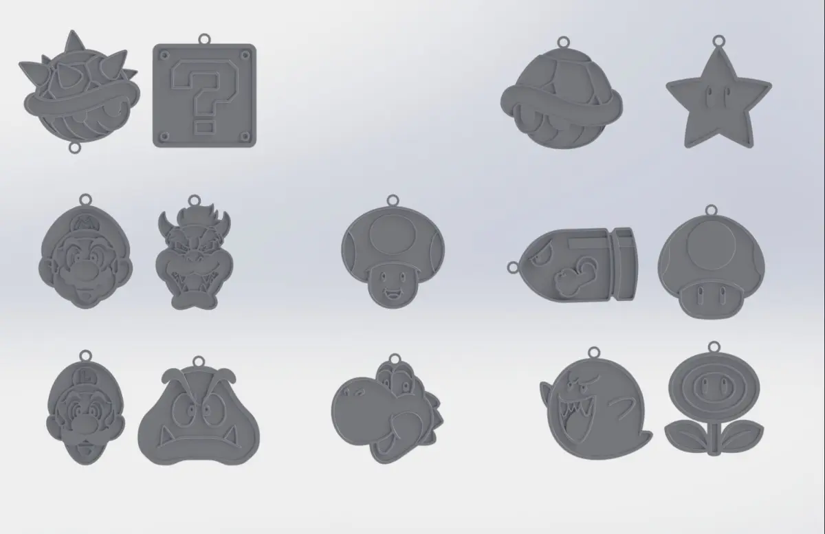 This set contains 14 different models of Super Mario universe: Power Star, Blue Shell, Surprise Box, Red Shell, Mario, Bowser, Toad, Bullet Bill, Mushroom, Luigi, Goomba, Yoshi, Boo, Flower.