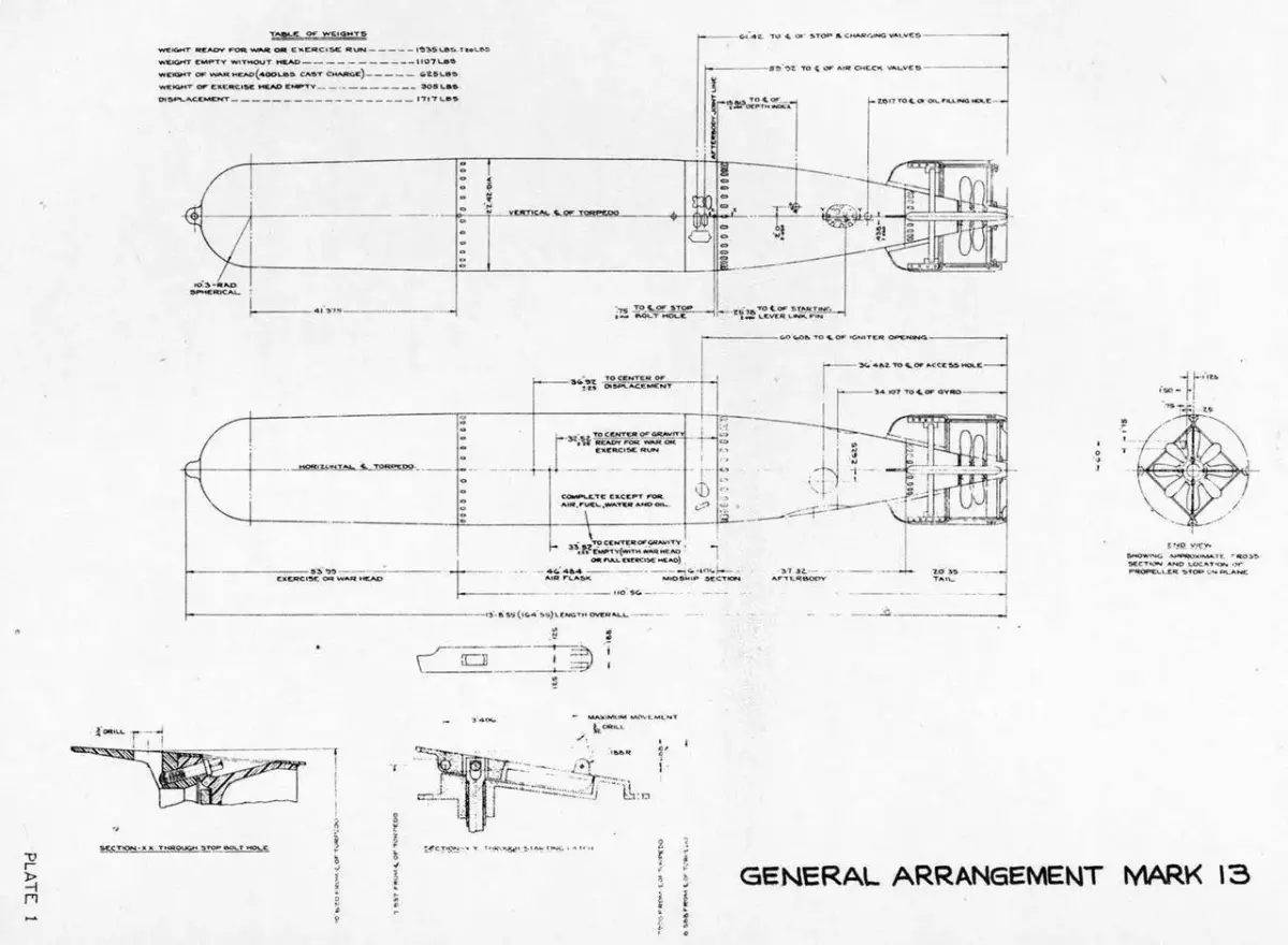 The Mark 13 was the United States Navy’s primary aircraft-launched anti-ship torpedo during World War II. Designed for deployment from carrier and land-based aircraft, it was a straight-running, gyroscope-stabilized weapon intended to strike surface ships. It used a wet-heater (steam) propulsion system and carried a high-explosive warhead sized to seriously damage or sink medium and large warships. Early in the war the Mark 13 suffered reliability problems when dropped from typical bombing altitudes and speeds, but modifications to its nose, tail, and drop procedures greatly improved its performance. By mid-war it became a dependable weapon in carrier air strikes, playing a significant role in Pacific naval engagements.