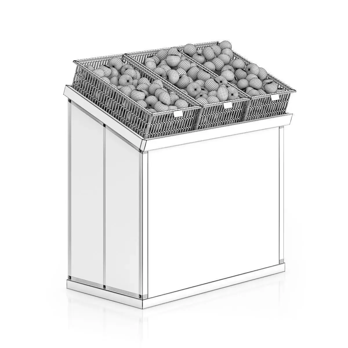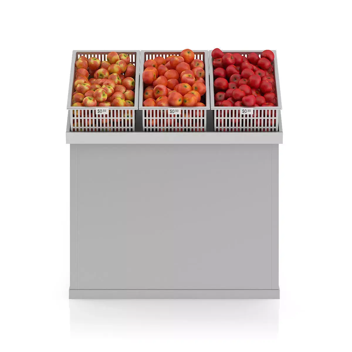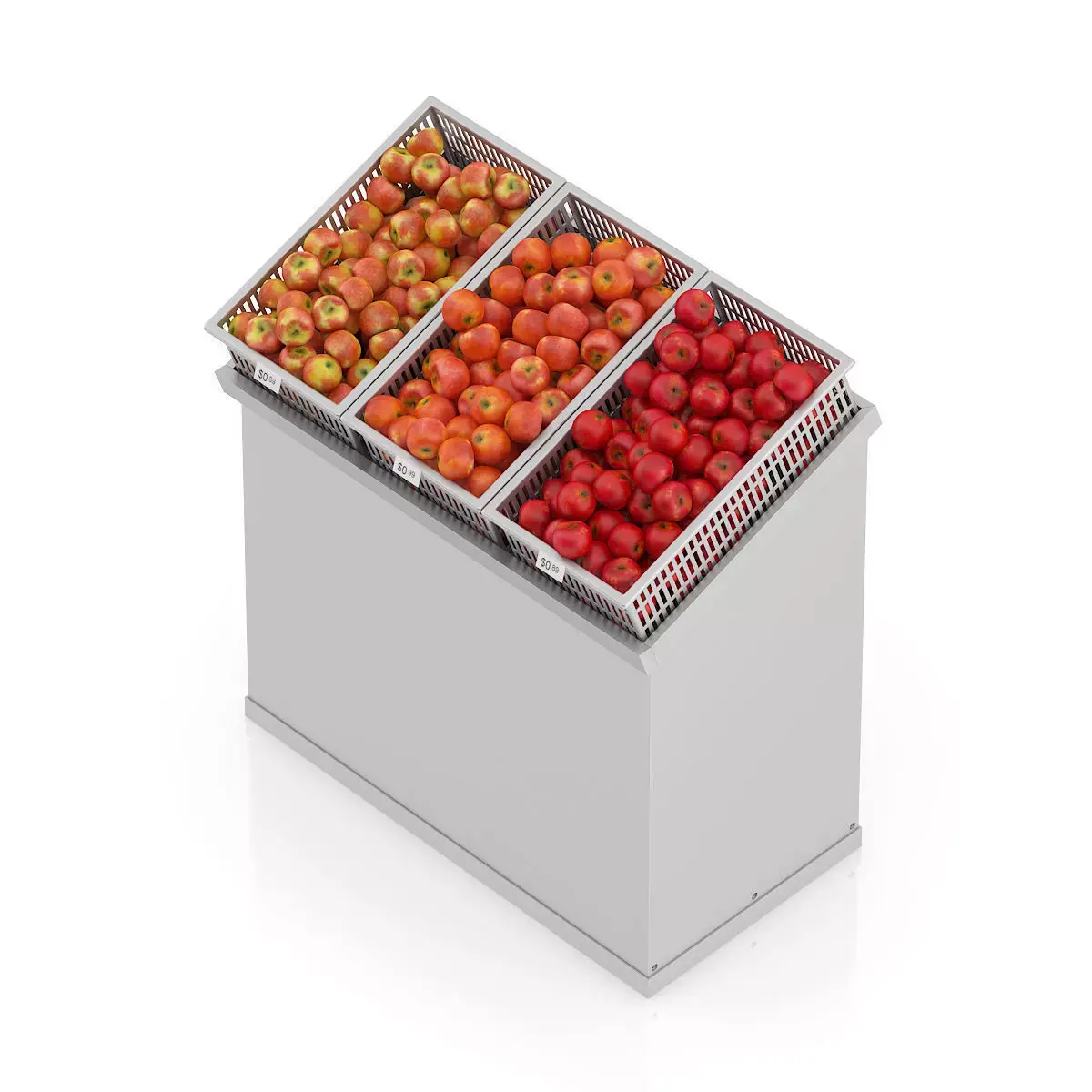 3d model of supermarket shelf with three kinds of apples. Compatible with 3ds max 2010 or higher and many others.