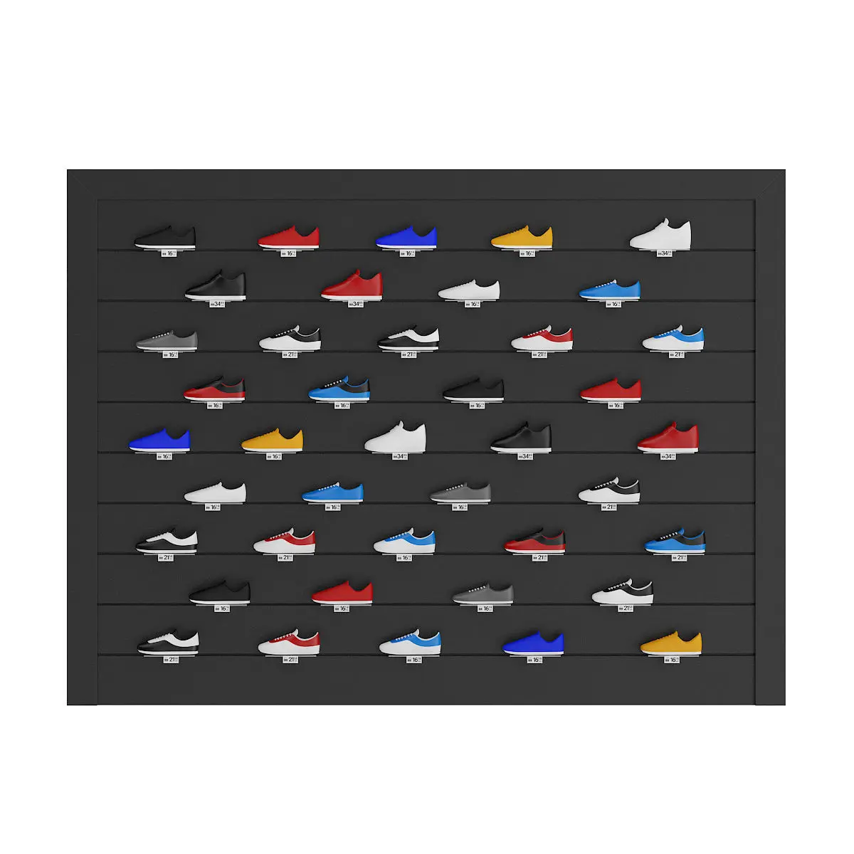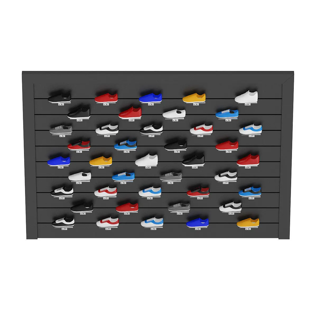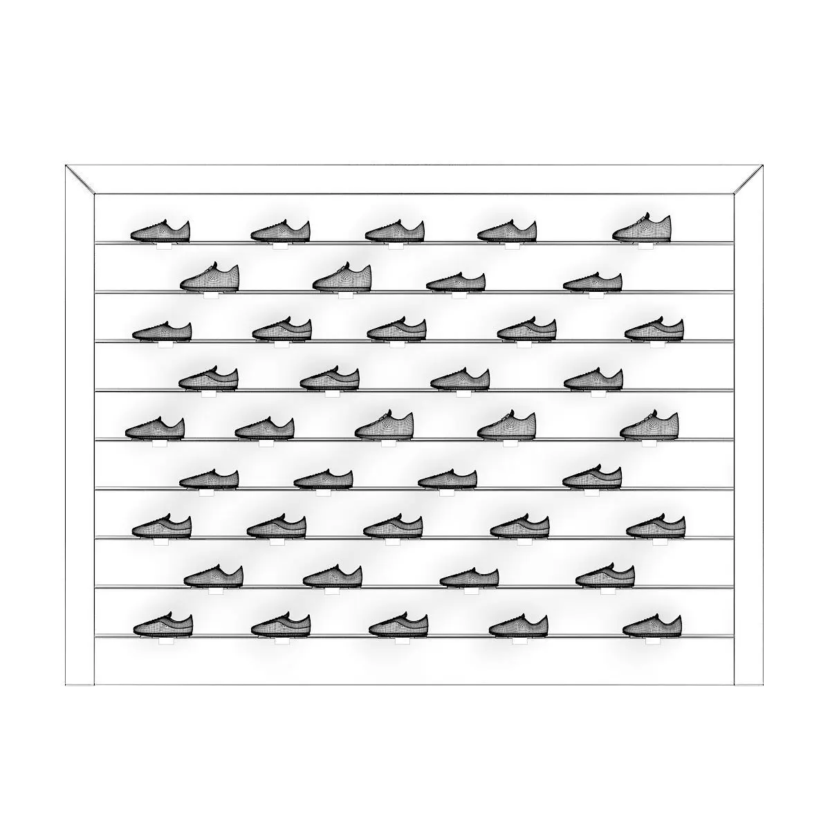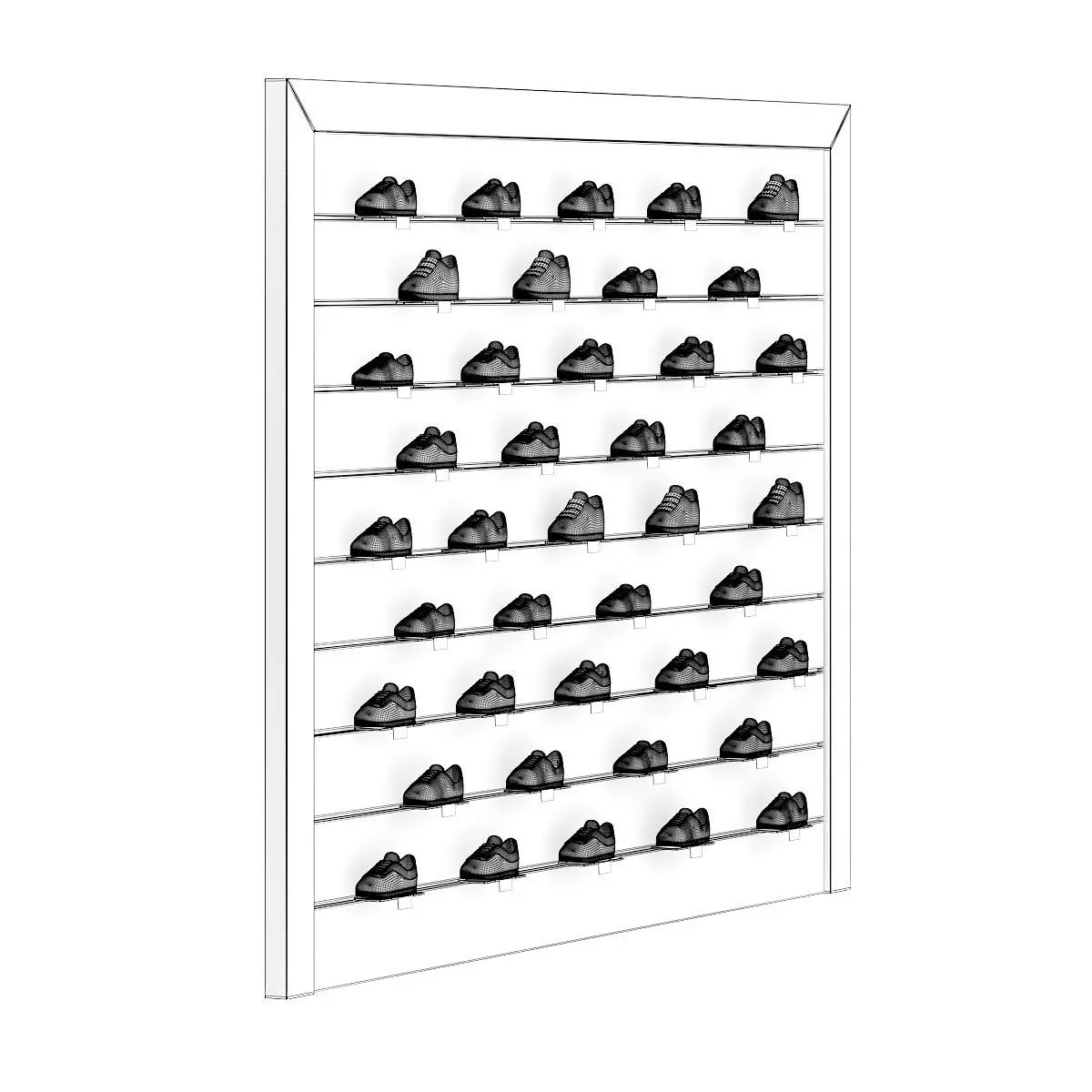 3d model of market shelf with various sport shoes. Compatible with 3ds max 2010 or higher and many others.