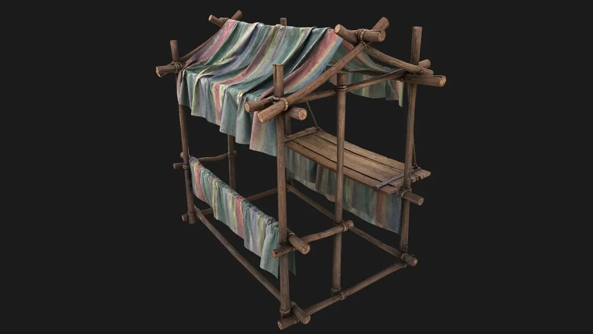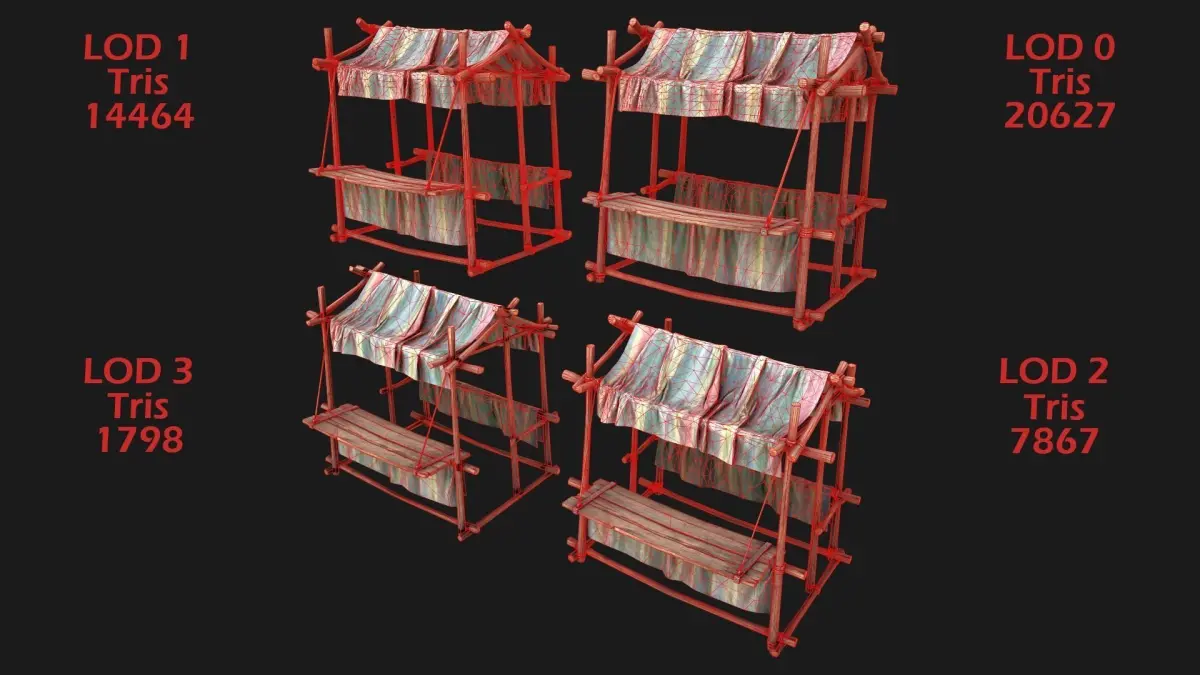 Game ready model. Market Stalls Tent fully textured, sculpted and rendered with Physical based rendering (PBR) - Shown images have been rendered in Marmoset Toolbag .The models contains lods, detailed information on the images.The model consists of two UV Maps :Tent(4096x4096).