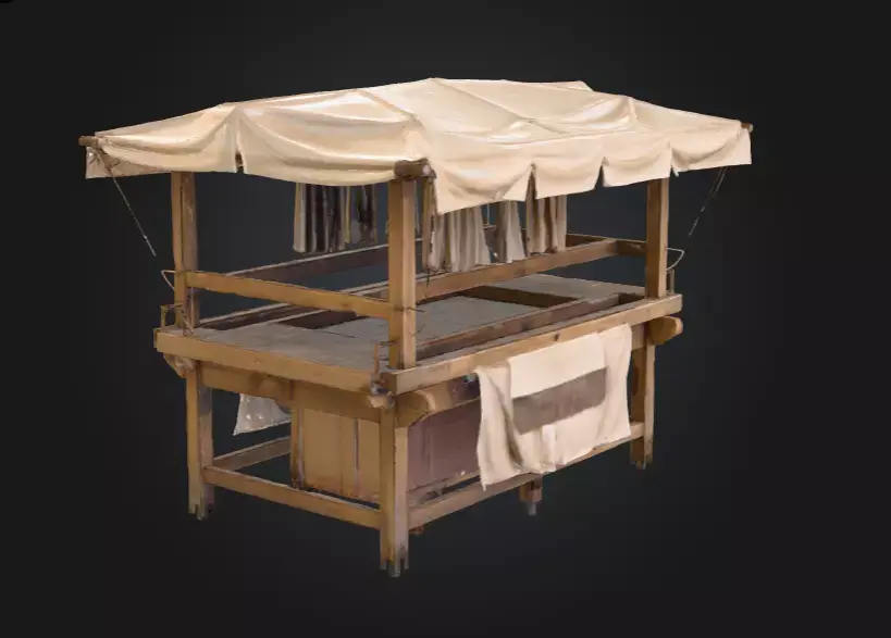 Every element of the Market Stall Display has been designed with storytelling in mind. The wooden framework shows signs of wear and grain detail, while the draped fabric appears naturally tattered and faded by time. The ropes securing the canopy add an artisanal touch, emphasizing the handmade aesthetic of pre-industrial markets. The model’s composition offers flexibility — it can serve as a merchant’s booth, trading stand, bazaar display, or crafting area in both realistic and stylized settings.