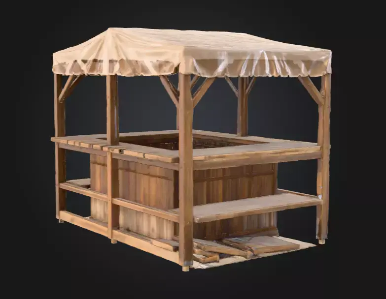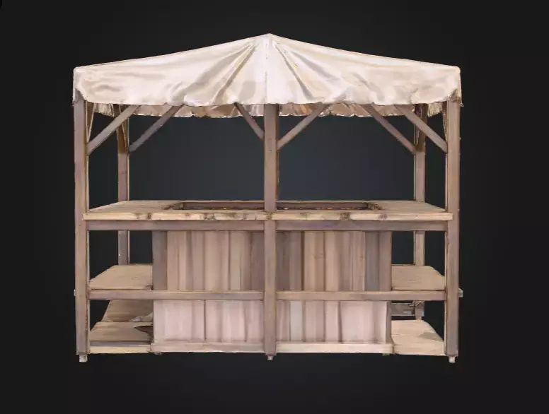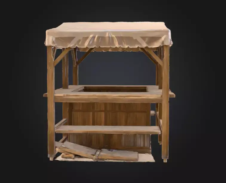 Every element of the Market Stall Display has been designed with storytelling in mind. The wooden framework shows signs of wear and grain detail, while the draped fabric appears naturally tattered and faded by time. The ropes securing the canopy add an artisanal touch, emphasizing the handmade aesthetic of pre-industrial markets. The model’s composition offers flexibility — it can serve as a merchant’s booth, trading stand, bazaar display, or crafting area in both realistic and stylized settings.