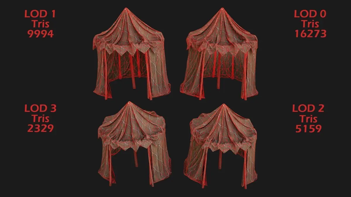 Game ready model. Market Stalls Tent fully textured, sculpted and rendered with Physical based rendering (PBR) - Shown images have been rendered in Marmoset Toolbag .The models contains lods, detailed information on the images.The model consists of two UV Maps :Tent(4096x4096).