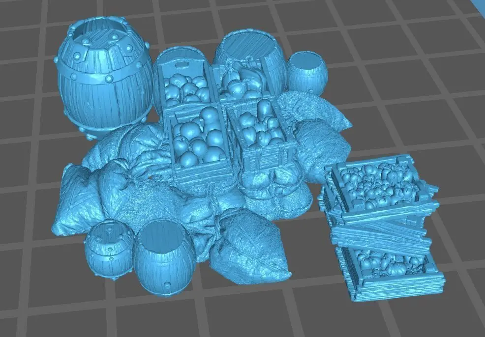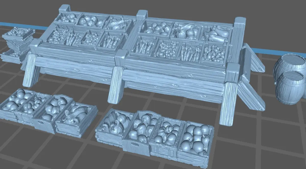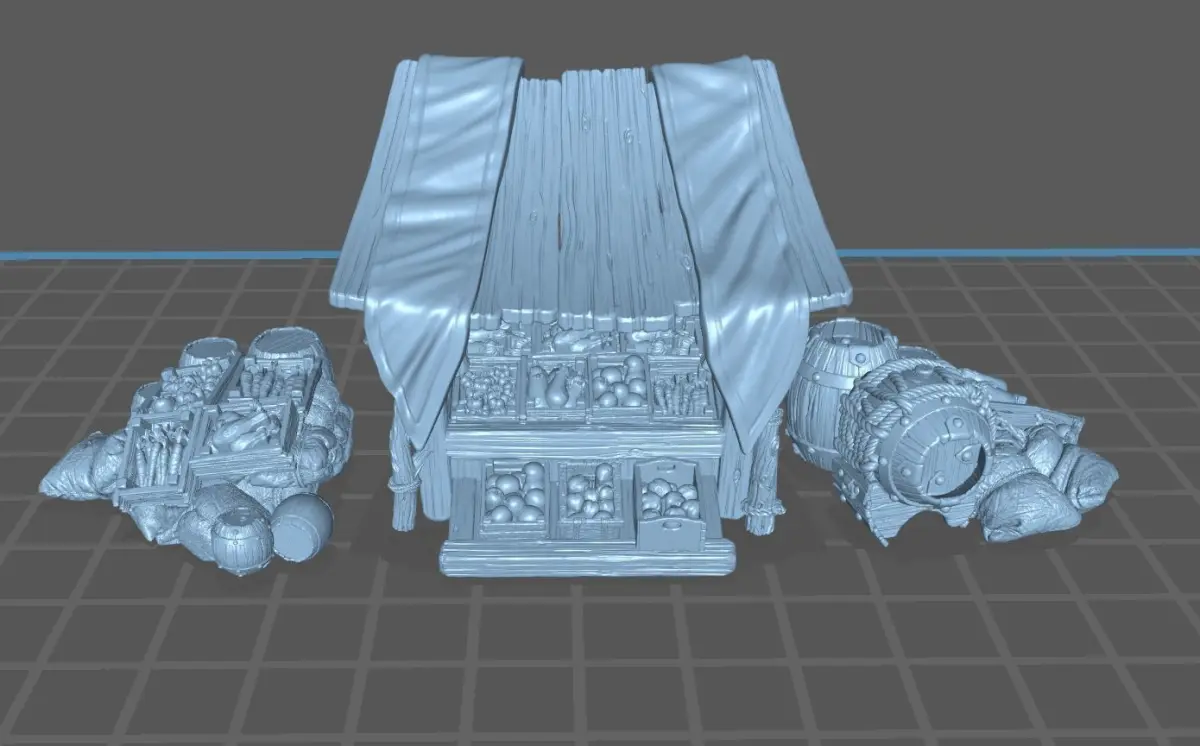 This is a bundle of STL's designed to make a Bazaar/Marketplace in a medieval/fantasy style, with wooden barrels, boxes of vegetables, and little shops/booths to purchase items from. Please see pictures for details.
