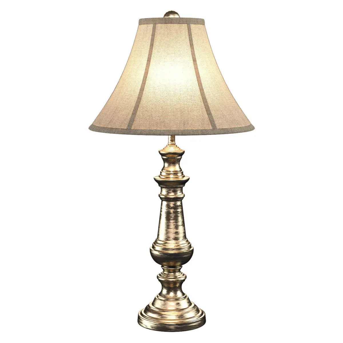 Faux silk soft back shade Steel construction Polished brass finish Includes a 3-way socket but requires a type A bulb and not standard CFL
