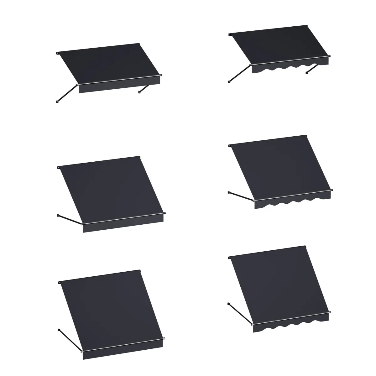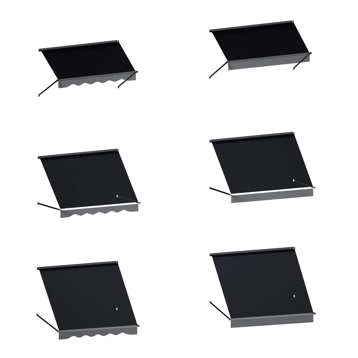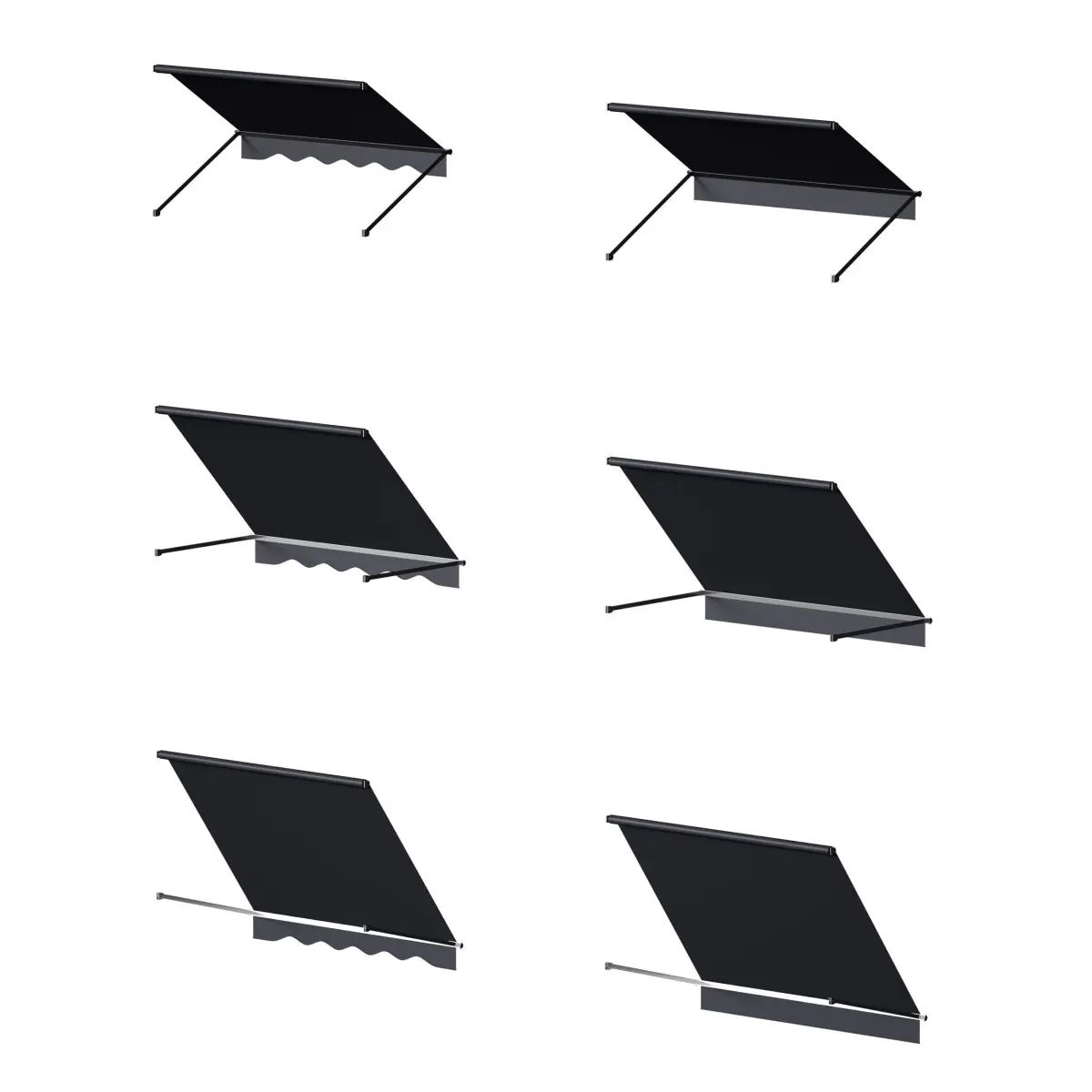 3D model of a window elbow awning in three different positions of the mechanism, with a straight and wavy edge. The frame is made of chromed metal, the fabric is black. The model is made for smoothing.