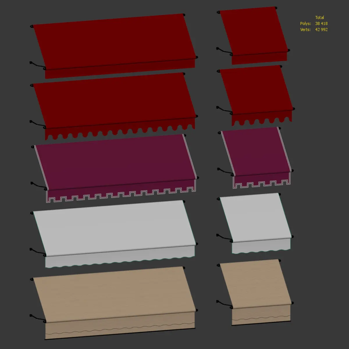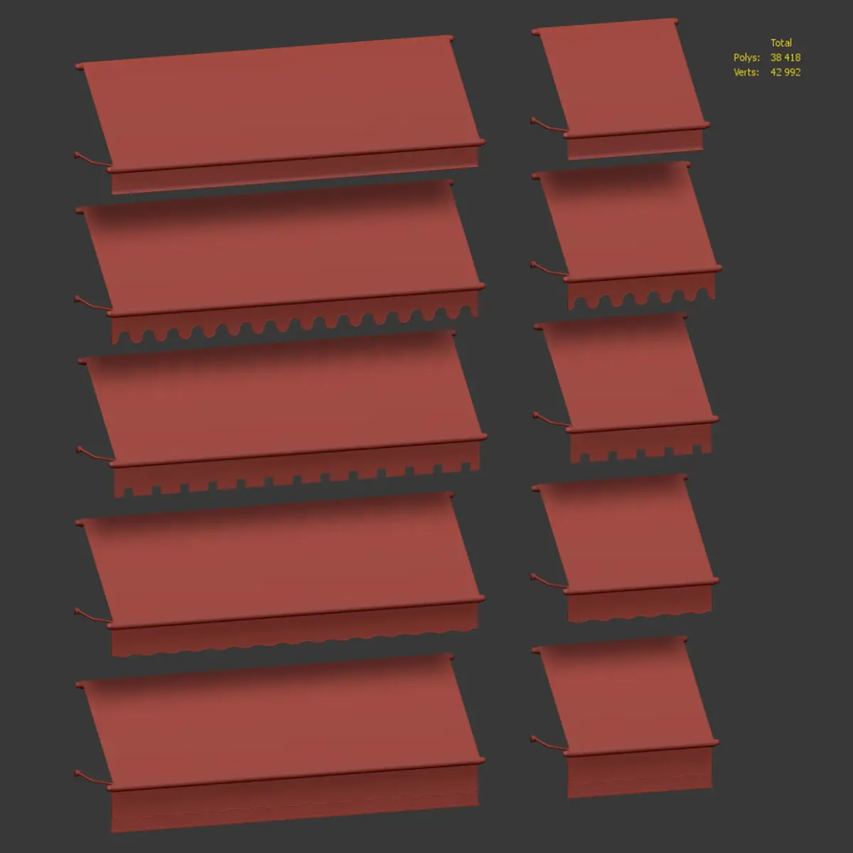 5 Low-poly Awning ModelsContains:Awning with straight edgeAwning with wavy edging - 2 typesAwning with scalloped edgeAwning with straight and wavy edging
