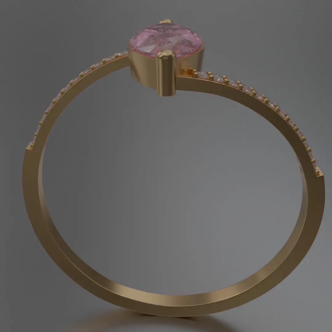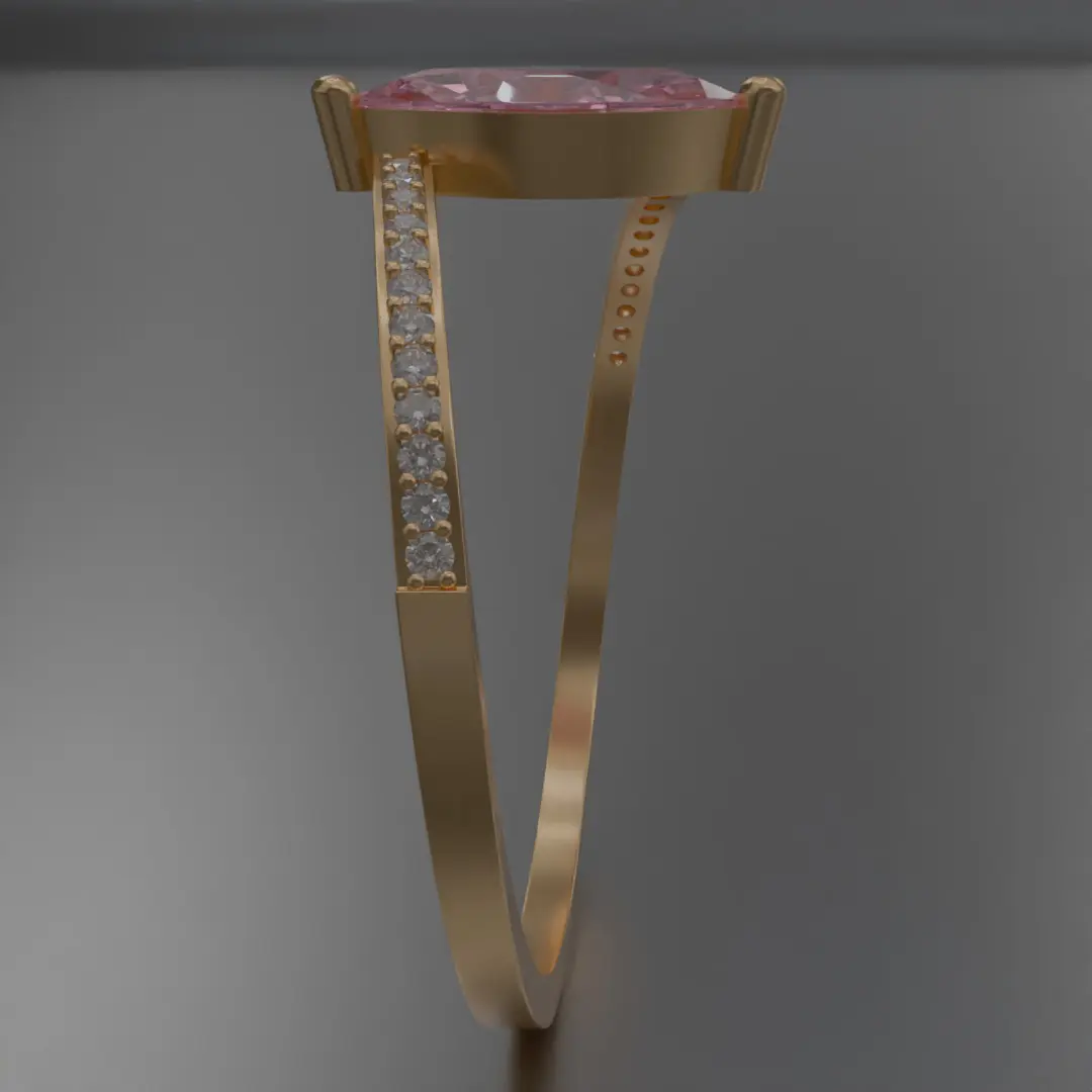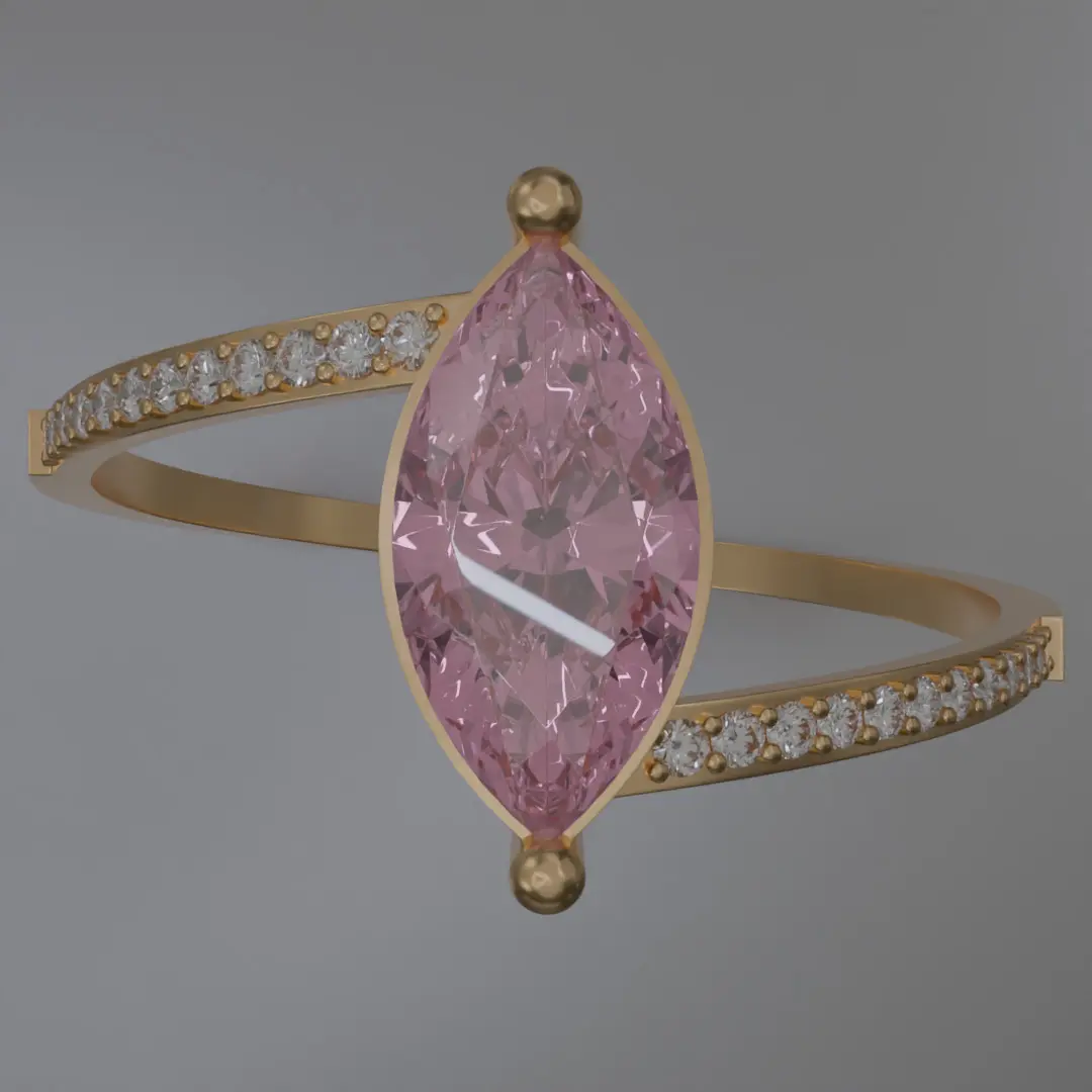 This meticulously crafted digital piece features:Central Gemstone: A striking marquise-cut pink stone, carefully set in a delicate open-end bezel mount, designed to catch light from every angle and radiate soft romantic brilliance.Diamond Accents: The band is adorned with finely arranged micro pave diamonds on both sides, enhancing the sparkle and lending a sense of modern opulence.Material Aesthetics: Rendered in polished gold, the ring balances warmth and richness, perfect for digital scenes centered on luxury, engagement, fine jewelry branding, or character design.Form Factor: The slender and graceful silhouette ensures the ring complements a wide variety of visual compositions, from close-up product shots to elegant cinematic frames.