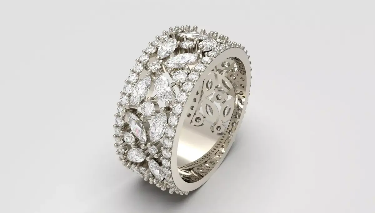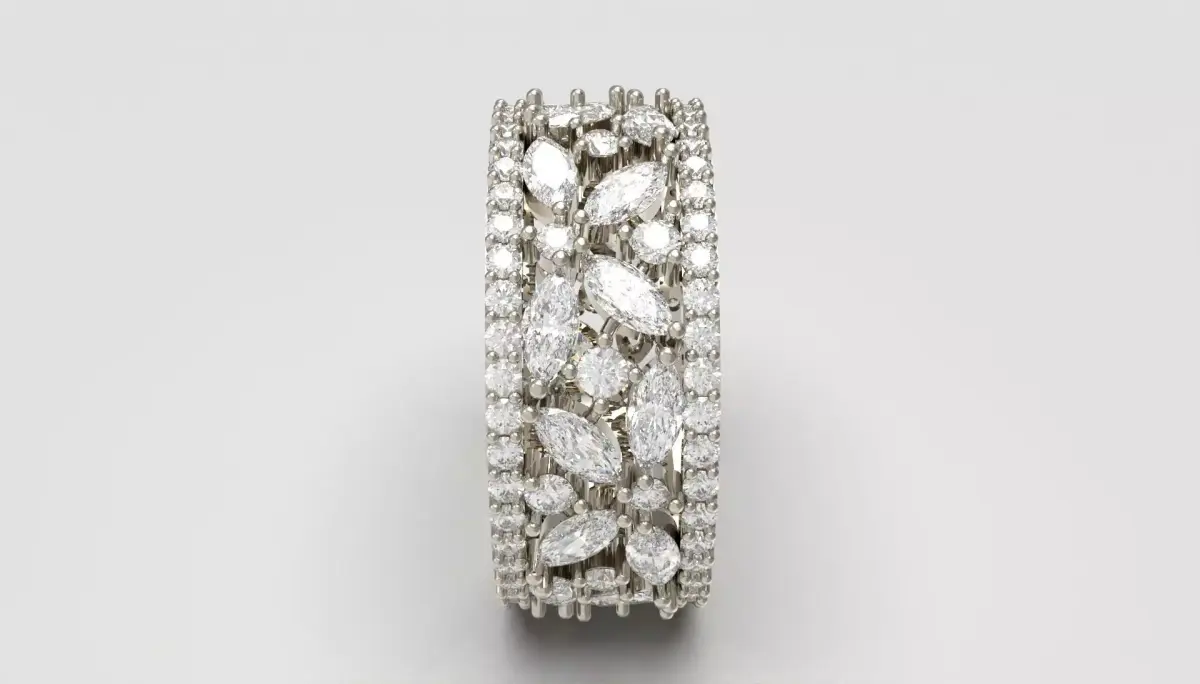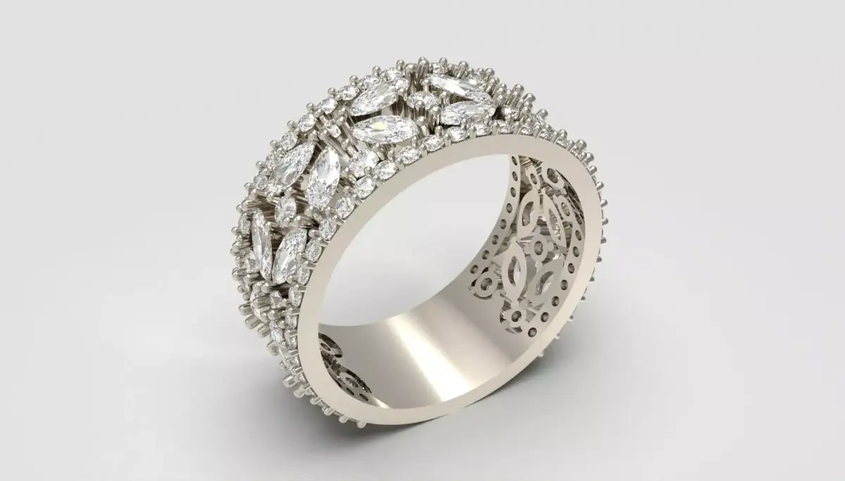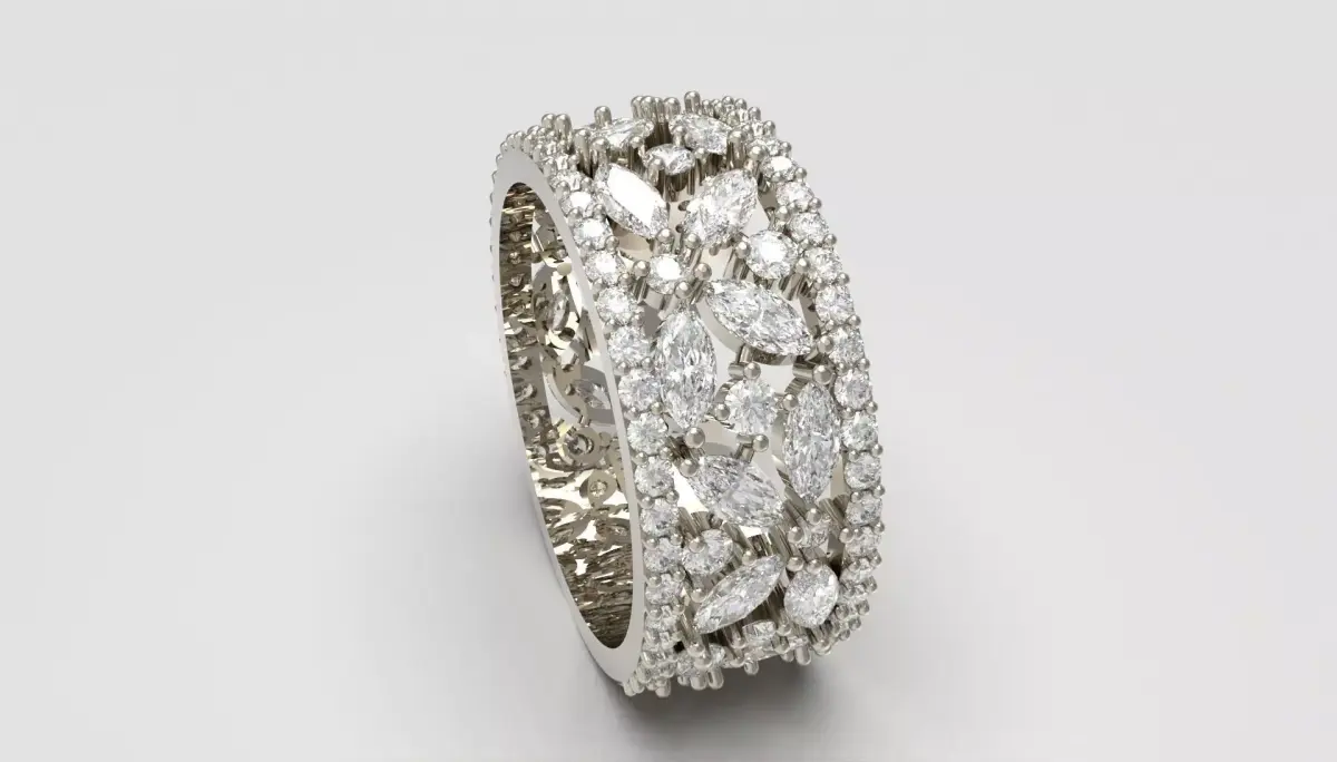 This captivating diamond band is designed to mesmerize at first glance.A shimmering composition of marquise and round brilliant diamonds forms a radiant floral lattice that glows with striking dimensional sparkle.The elongated marquise stones create an elegant rhythmic pattern, while the surrounding round diamonds enhance every contour with a soft, luxurious halo of light.The openwork structure adds airiness and depth, allowing brilliance to flow effortlessly through the piece.Finished with a delicately detailed inner filigree, this ring offers a breathtaking balance of sophistication, texture, and luminous beauty—an unforgettable statement crafted to shine in any high-end visual presentation.For any edit or revision: +447301387795 or elpouriapaypal@gmail.com