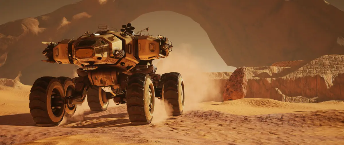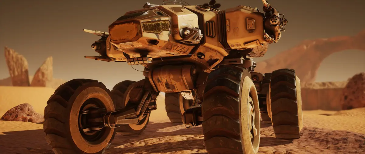 A heavy semi industrial vehicle with sci fi accents in, 12 meters tall and roughly 30 long, the guns can be removed easily and be left as an industrial/scout/research vehicle.