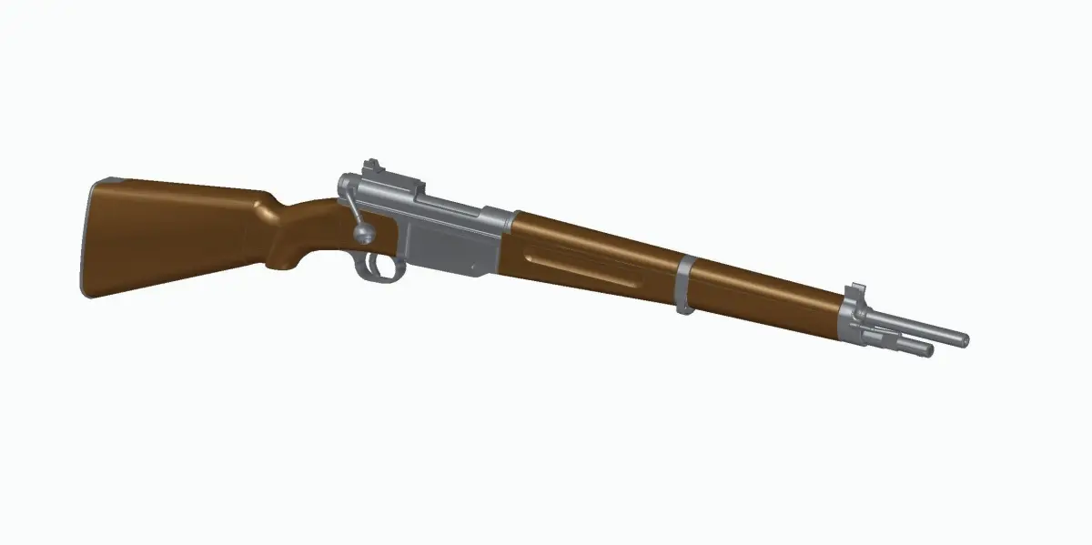 Full assembled model of French rifle and its 7,5x54 mm bullet and bayonet.