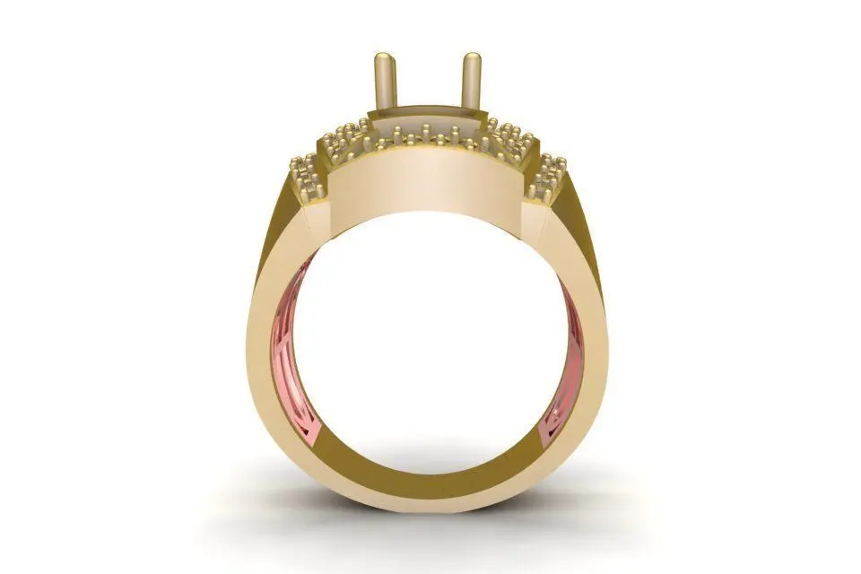The model’s top surface is designed for a large gemstone such as diamond, moissanite, ruby, or sapphire, with precise prong settings for secure stone placement. The side shank is carefully detailed to enhance depth and reflection, creating a balanced blend of elegance and strength.