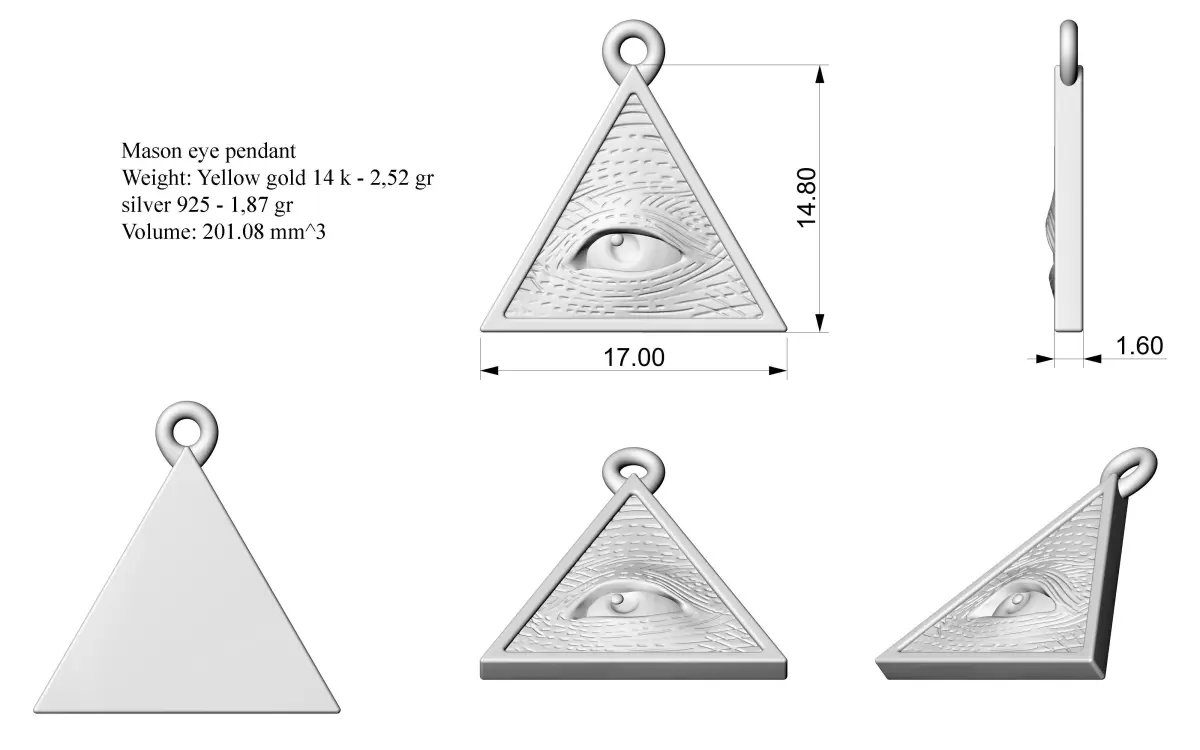 Mason eye pendant Weight : Yellow gold 14 k - 2,52 gr silver 925 - 1,87 gr Volume: 201.08 mm^3