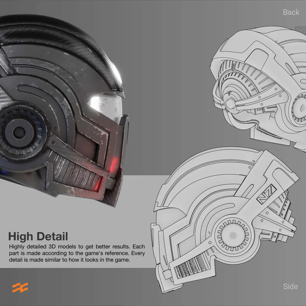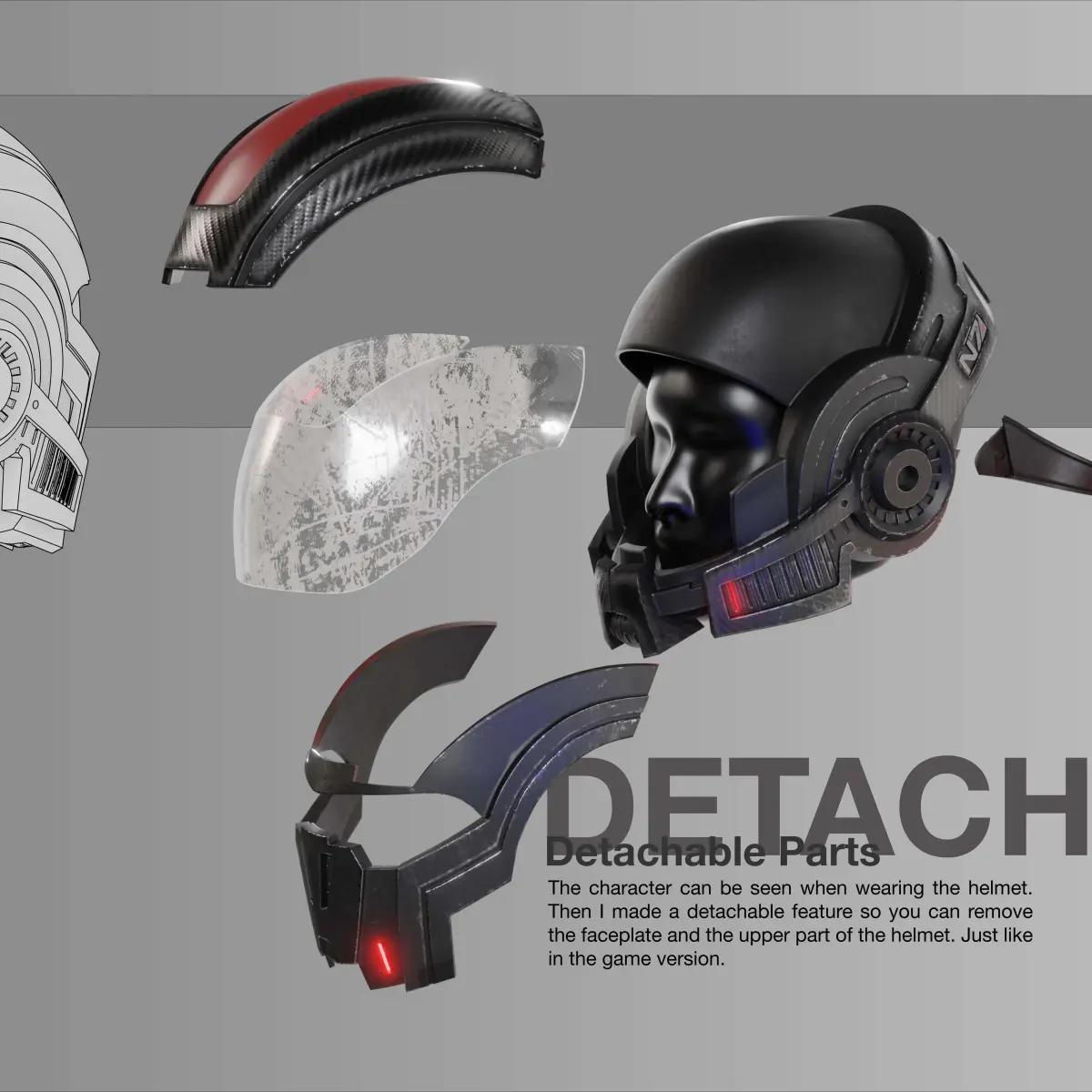 3D Printable Model of Shepard's N7 Helmet from Mass Effect Game.A detailed model with joint, and separate parts for detachable features according to the original detail. There's a hole and cable line to make LED installation easier.Please, rescale the size to better fit your head. The default size is 255mm in width.