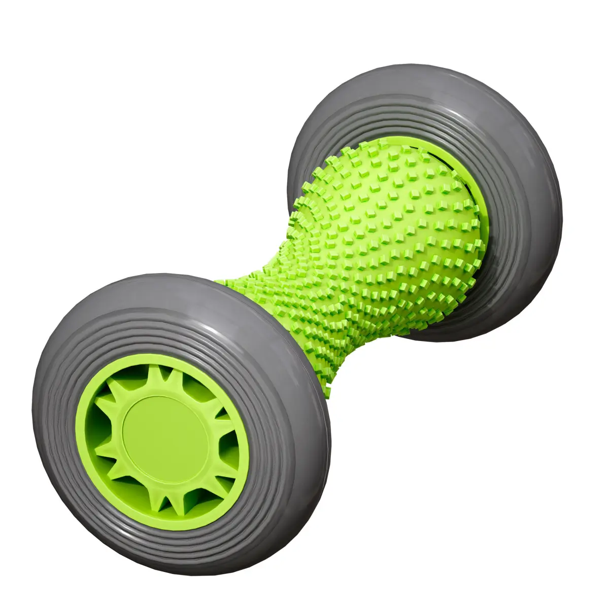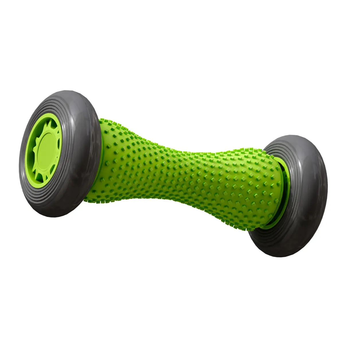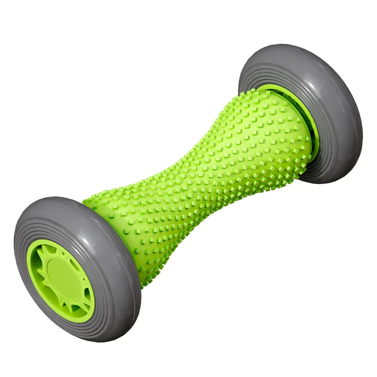 3d model of a massager, a massage roller on wheels. Working surface with bulges made of rubber. The color is bright green and grey.