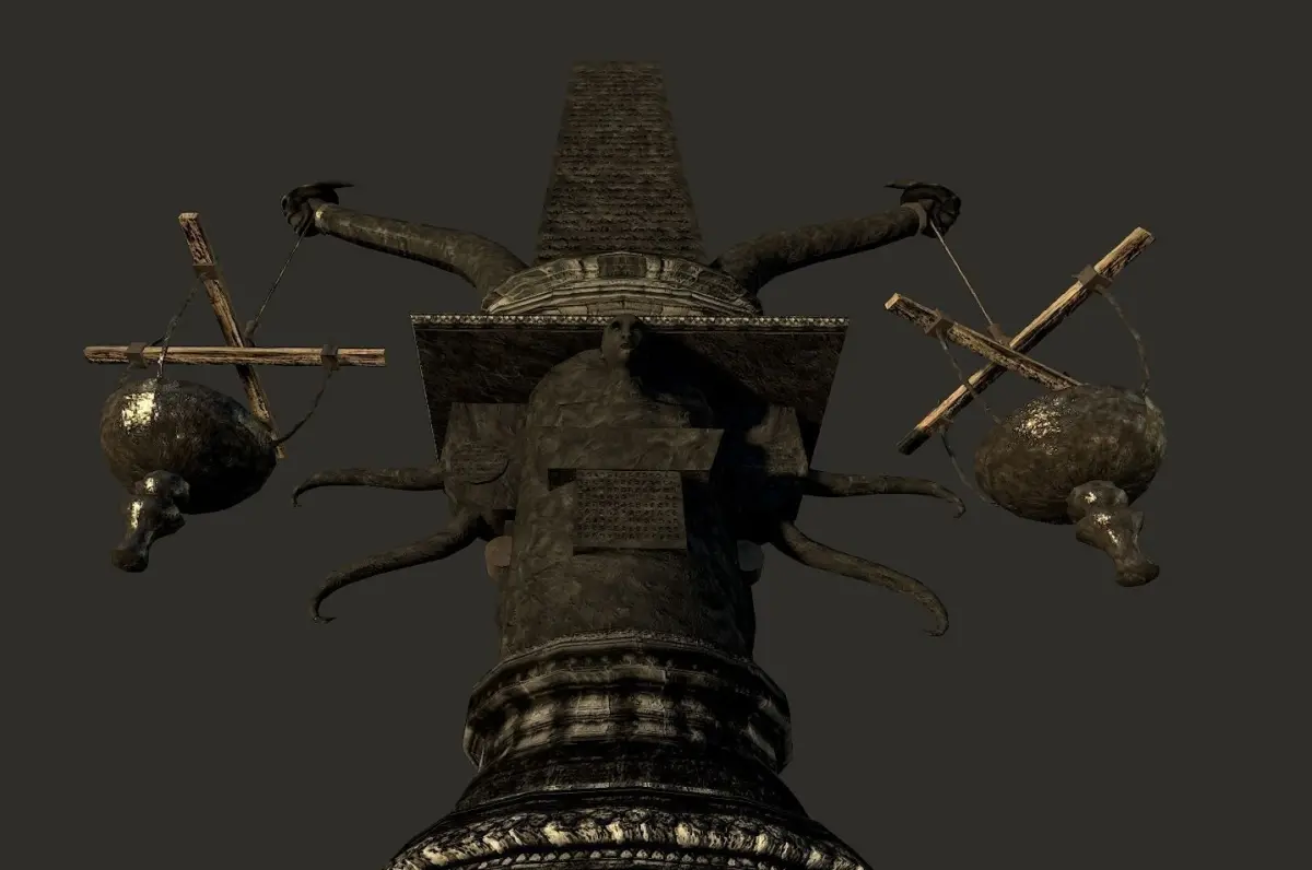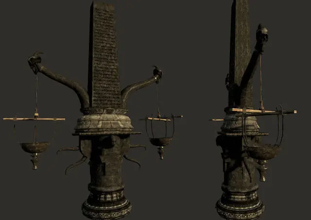 A truly large ornate torchholder for your fantasy dungeon!Designed in a dark rock, this is a detailed item that features carved tentacles ending in skulls holding large bronze torches suspended on wooden planks. It has been designed to have an omnious, evil look, perfect for most dungeon levels.The pillar holding these has a detailed sculpture representing a humanoid with some distinctive features that might also imply he is something else. It all ends in a large monolith covered in runes.
