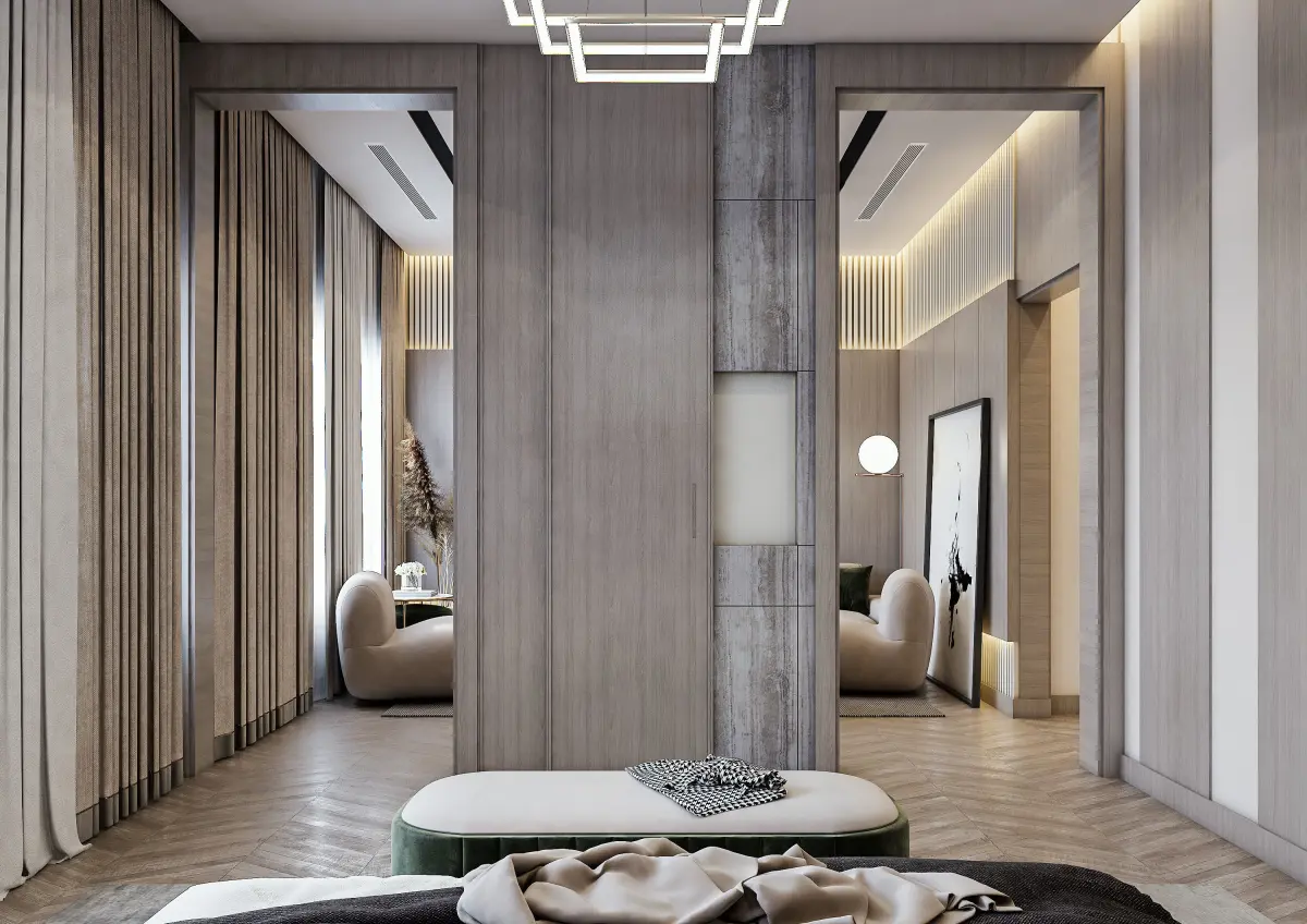 this is full scene of modern master bedroom design, the scene is fully textured with high quality materialsi used to model this scene 3ds max 2021 , vray next modern design with touch of luxuryi used high quality models , very clean materials the lighting system is perfect you can learn from ityou can use this scene to help you to complete your bedroom designs