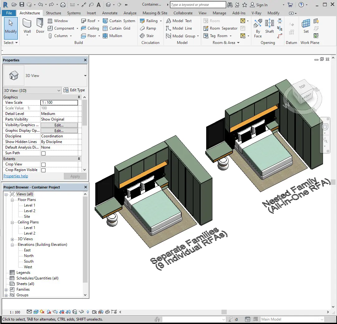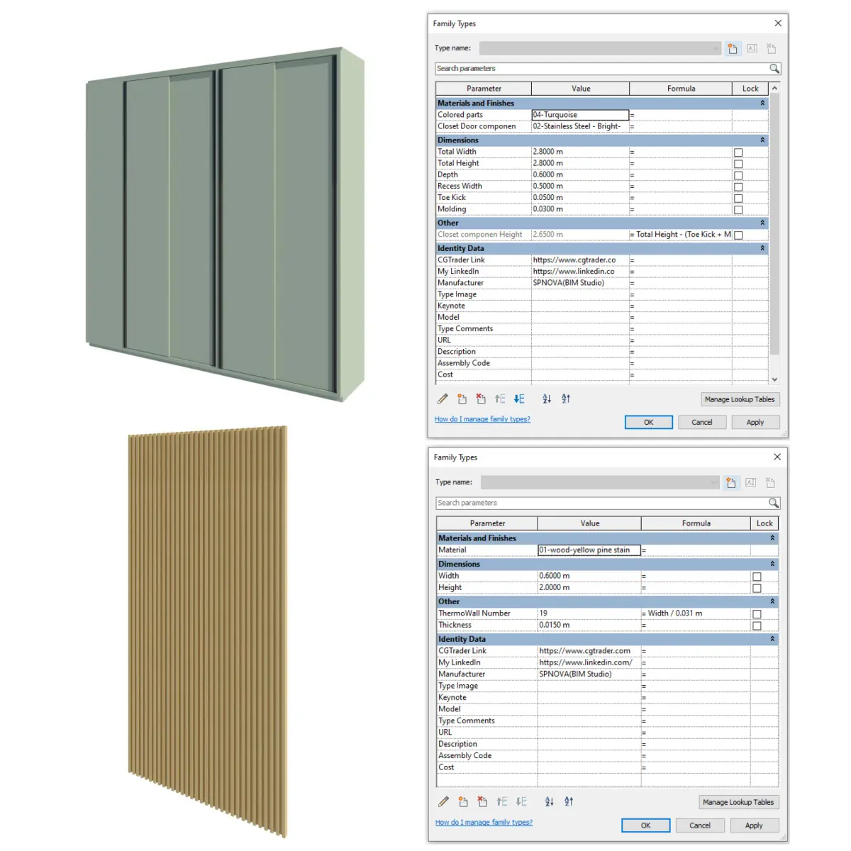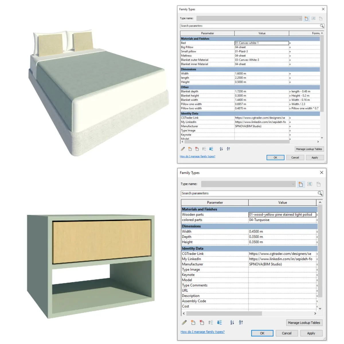 Transform your bedroom designs with this fully parametric family pack. This set includes 9 standalone Revit families (RFA) and a nested family version, covering essential furniture and decor such as wall cabinets, bedside lamps, a bed, a vanity table, a rug, a chair, and a shelf. You can easily modify dimensions and materials for full customization. Compatible with Revit 2018 and later.