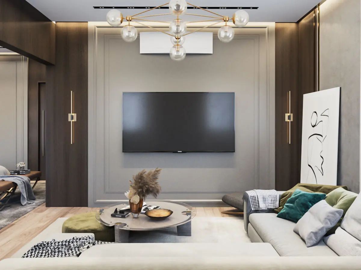 A Luxury design for Master Suite has master beroom area and seating area with TV. wall