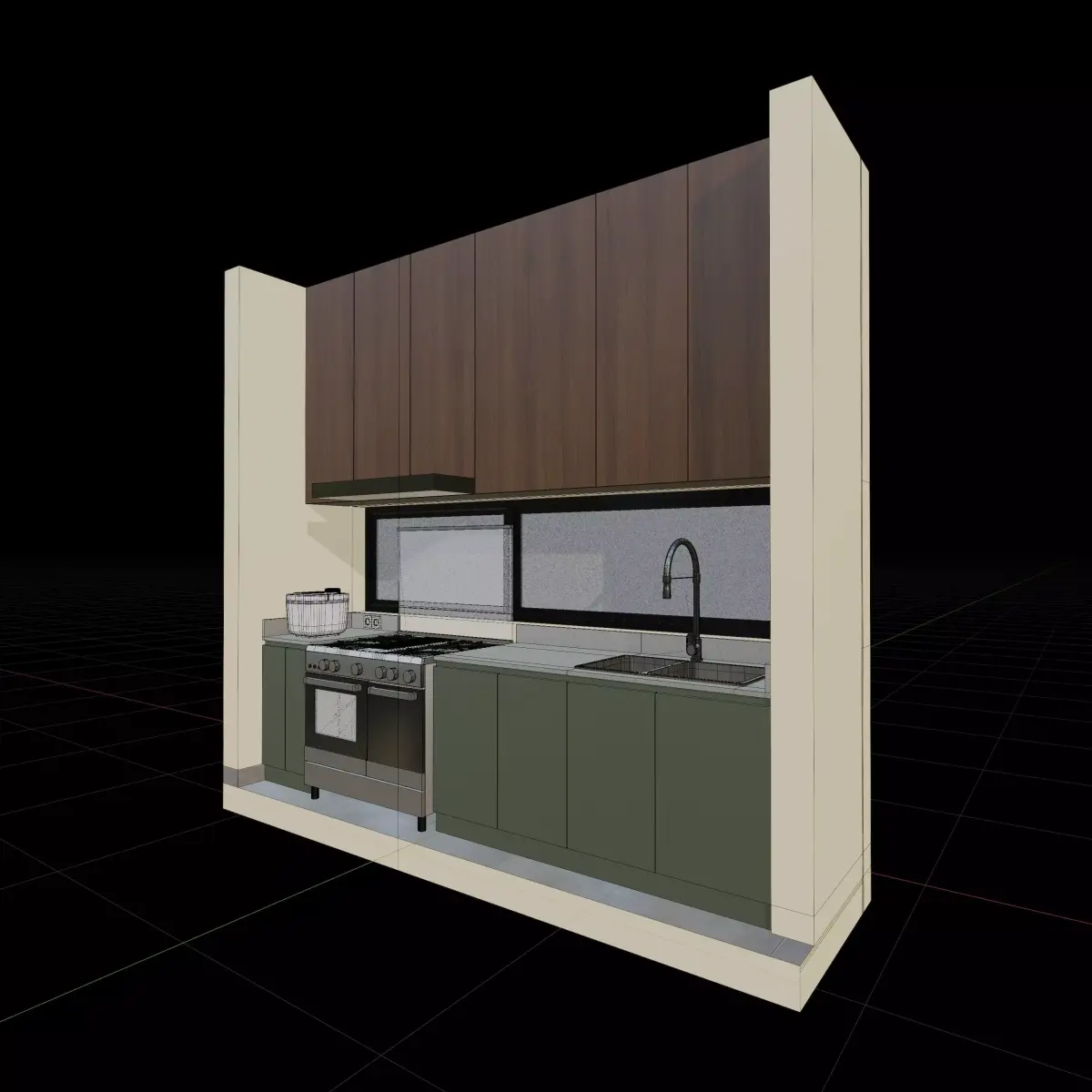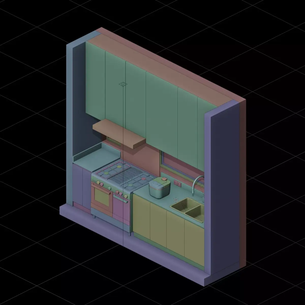Isometric home kitchen interior 3d scene, including a stove, a rice cooker, and a sink, in a kitchen room, suitable for kitchen interior scene. Originally made in Blender also available in .OBJ and .FBX files.