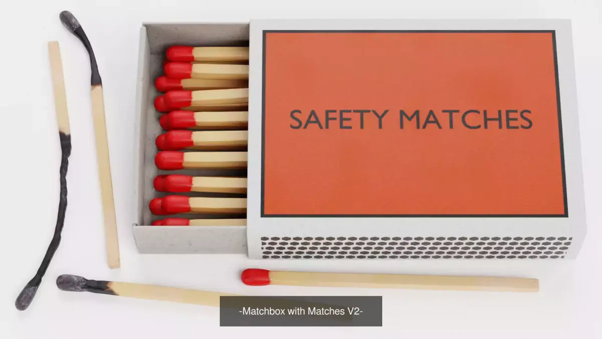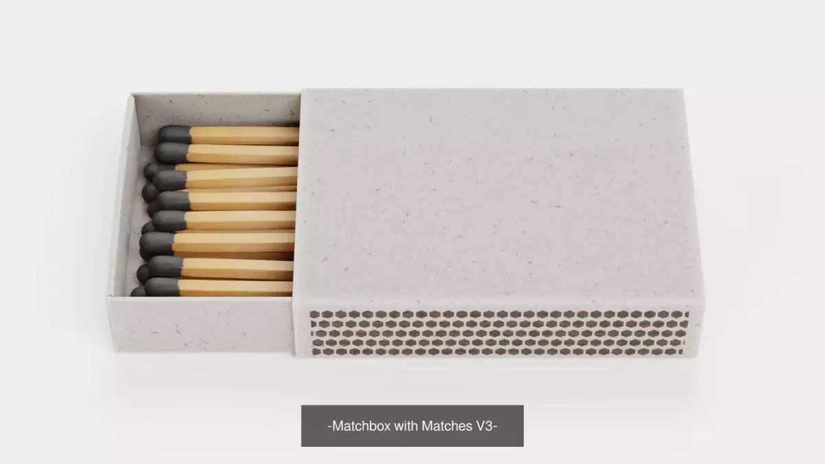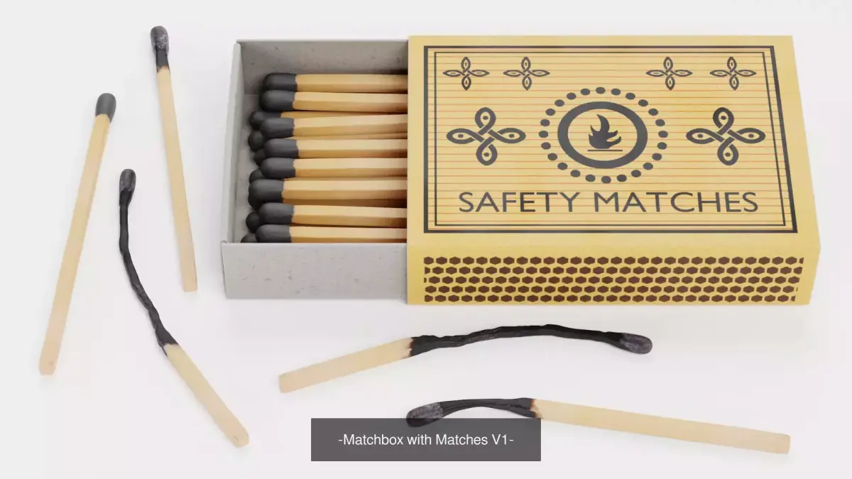 A photorealistic set of three filled matchboxes featuring neutral, orange, and yellow custom designs. Each box includes unused matches with red or black tips. The collection also adds a small set of loose matches in three stages of burn progression, providing extra flexibility for scene dressing, storytelling, and close-up visualization.