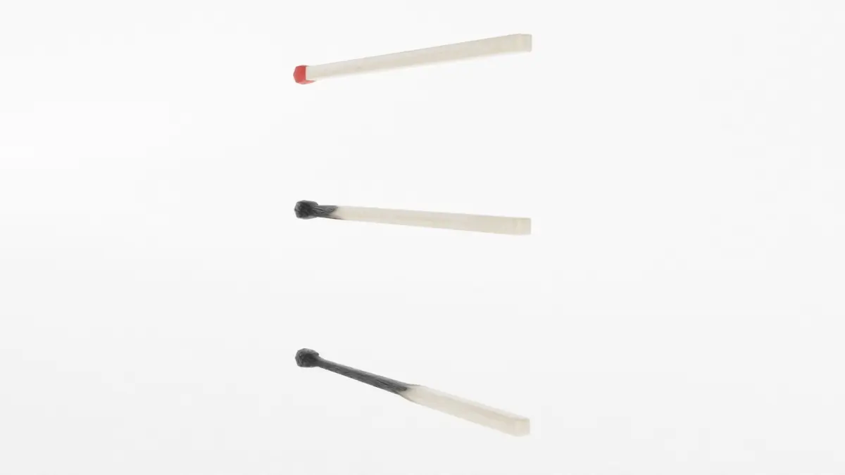 These models have real world scale (approximately 5.7 cm in length). The file consists of three seperate meshes: Match, Match_burned and Match_burned down. Exception: in the .ply-file they are all joined together.