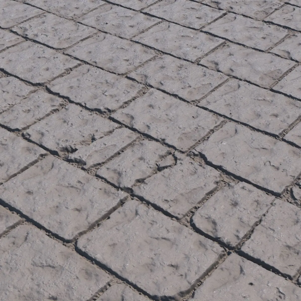 Square paving slabs made of artificial stone with cracks on some of the tiles.