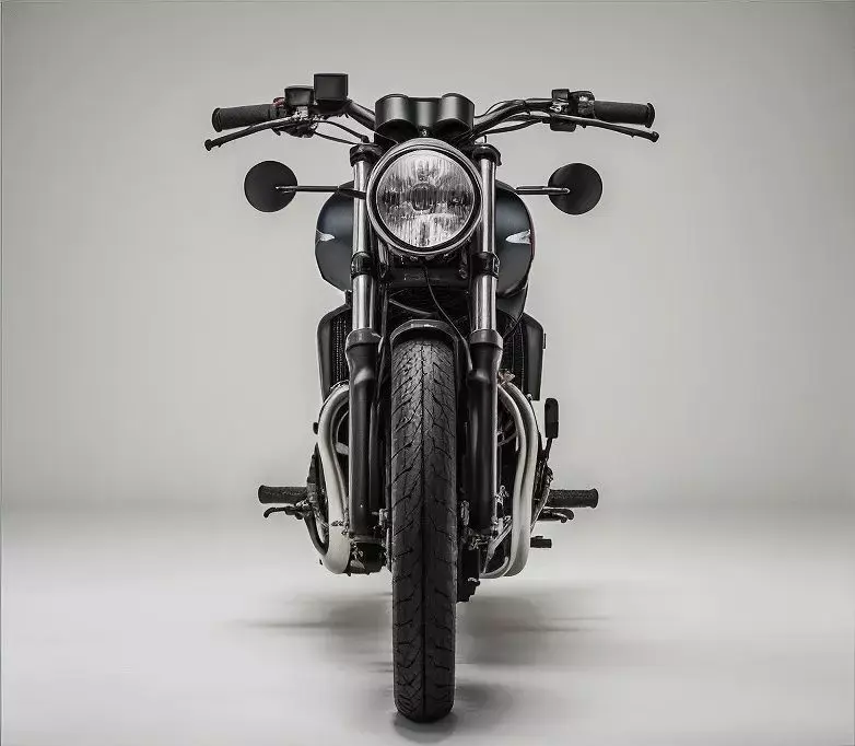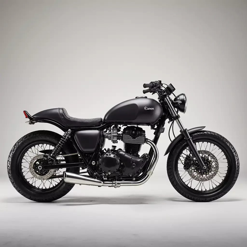 This 3D model depicts a stylish classic cafe racer motorcycle, presented in a sleek matte black finish that exudes a raw, minimalist aesthetic. The bike features iconic cafe racer elements such as the low-slung handlebars, a single-seat setup with a subtle hump, and a stripped-down, exposed frame. Key details include the prominent spoked wheels, knobby tires suggesting a slight scrambler influence, a polished exhaust pipe, and visible engine components with cooling fins. The round headlight and minimal tail light maintain the vintage appeal. This meticulously detailed model is perfect for automotive visualizations, game development, virtual environments, or any project requiring a distinctive and retro-inspired motorcycle asset.