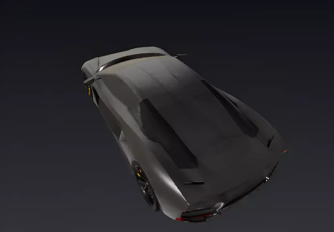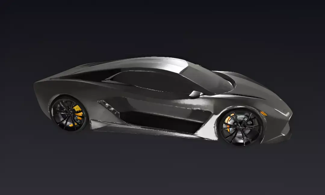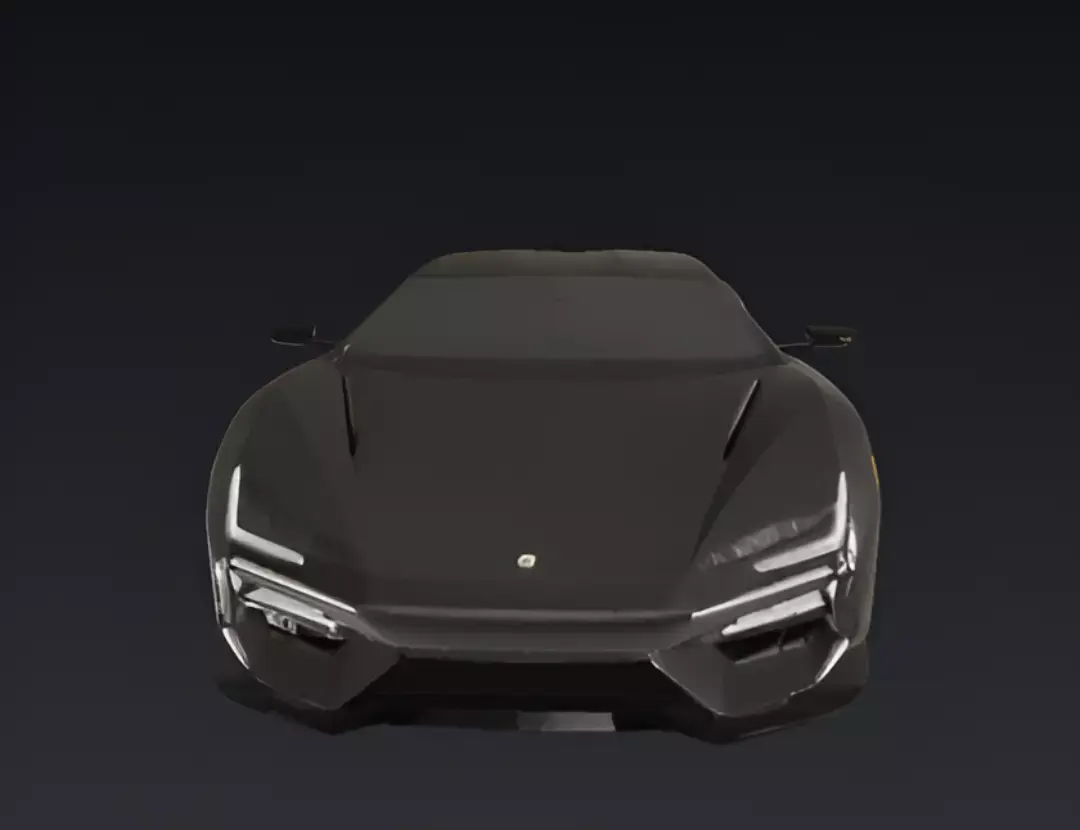 A sleek, matte black concept supercar is presented in a minimalist studio setting. The vehicle has a striking, low-profile design with sharp angles and prominent air intakes. Its most distinctive features are the futuristic, angular LED daytime running lights at the front. The car is equipped with multi-spoke bronze or brown wheels that provide a subtle contrast to the dark body. The simple background, with its neutral-colored walls and floor, along with two gray blocks, emphasizes the car's clean lines and futuristic aesthetic.
