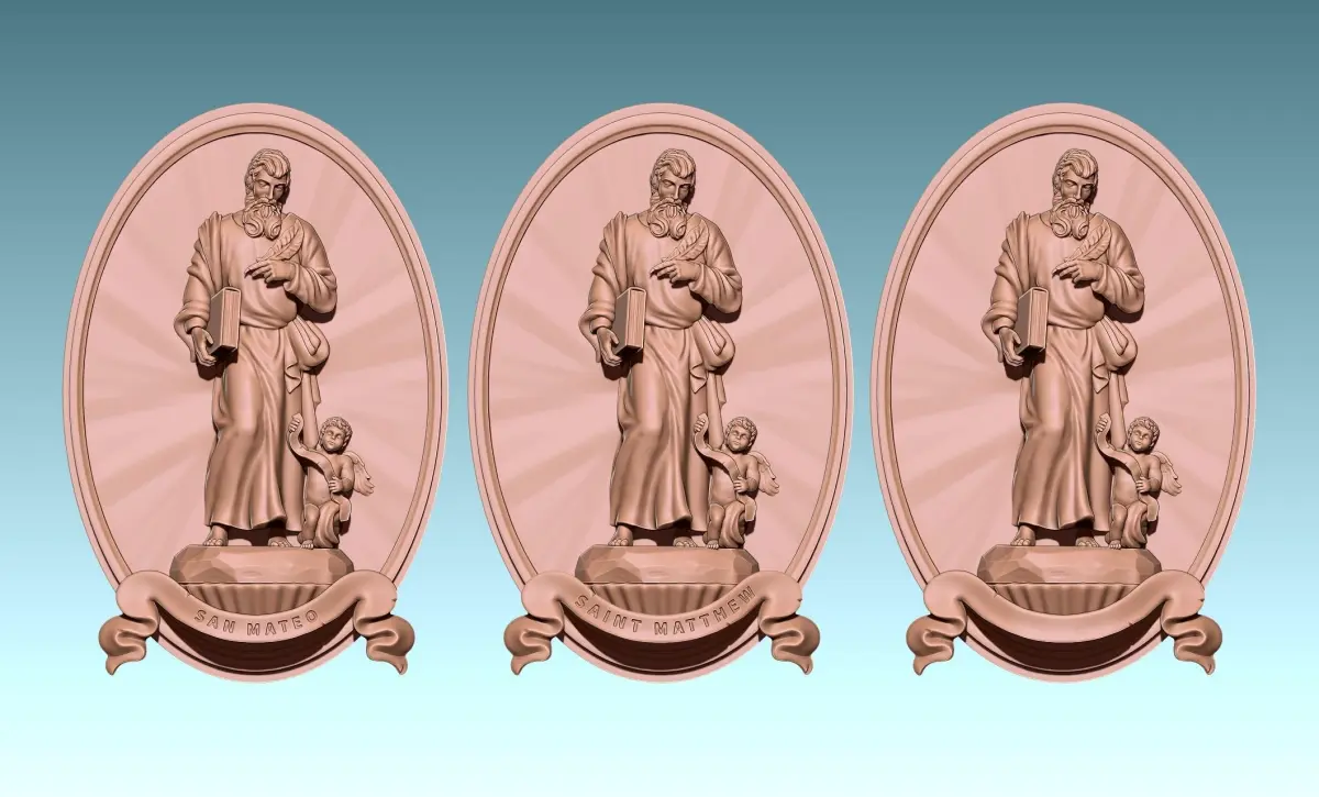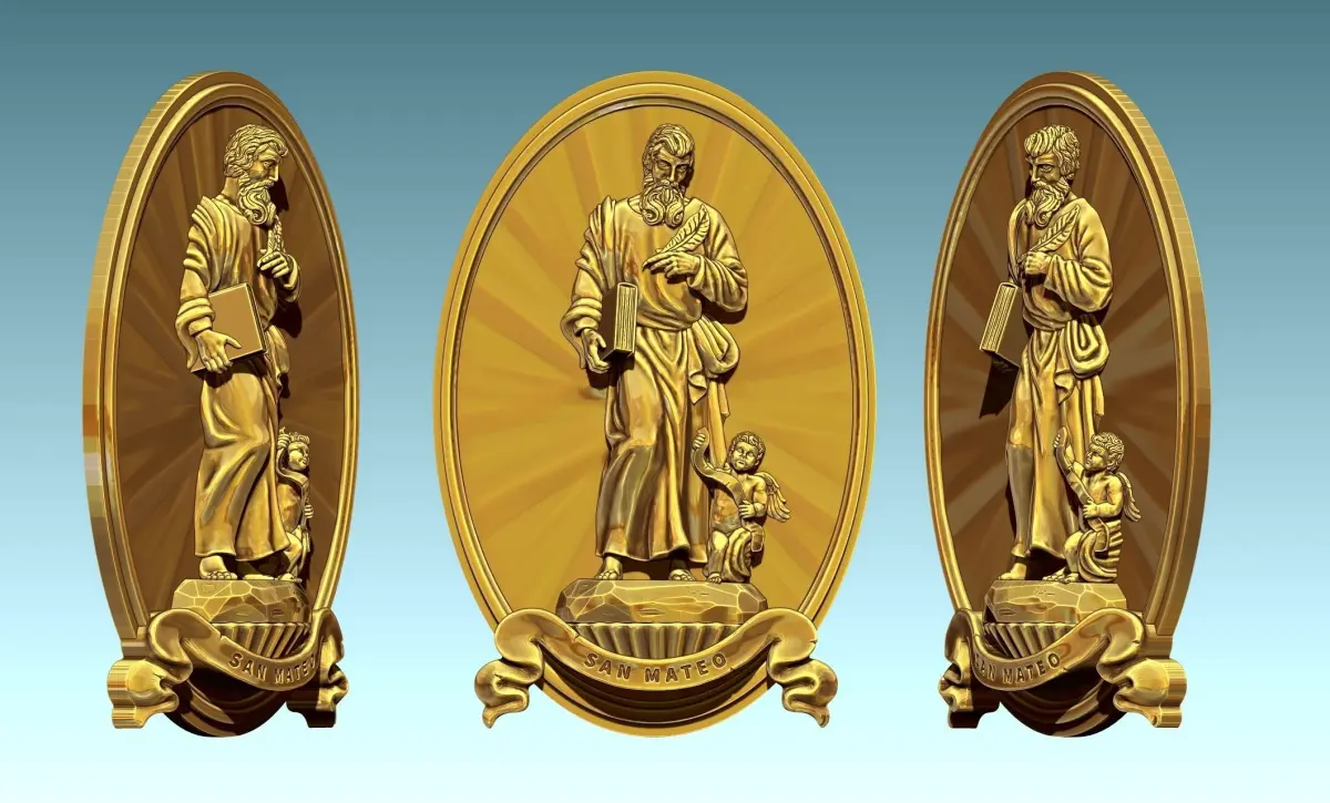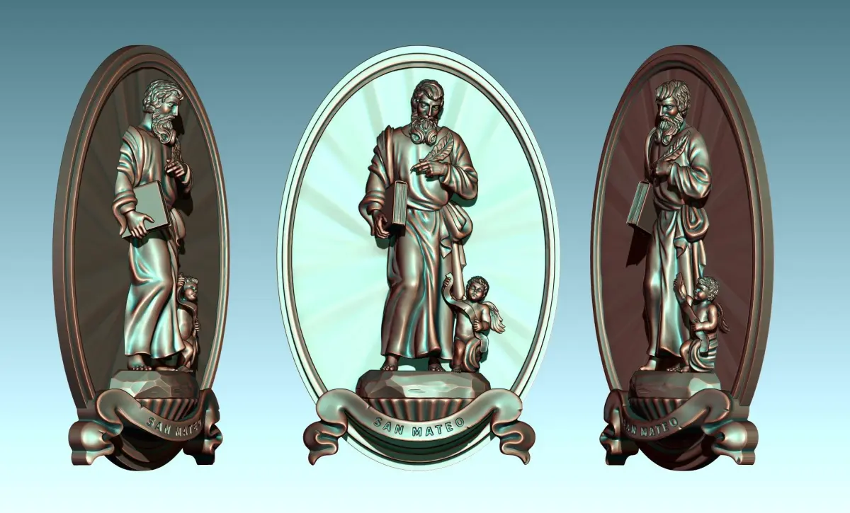 Modification of another work to create this relief, it can be used in decoration, jewelry, to create other models .... Originally designed for CNC Routing Machines, also can be printed. Based on classic designs of Catholic art., The model represents Mateo, one of the four evengelist. In the model I have tried to include all the symbology of the original figure, Specialy in the tunic and cape.... The file is ready for use, you can open it with Aspire or any CNC software. You can contact me if you find any problem.