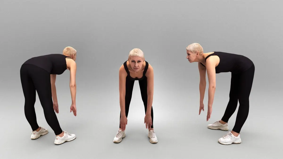 This is a true human size and detailed model of a sporty middle-aged woman of Caucasian appearance dressed in sportswear. The model is captured in casual pose to be perfectly matching various architectural and product visualizations, as a background or mid-sized character on a sports ground, gym, beach, park, VR/AR content, etc.