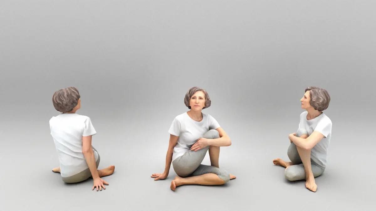 This is a true human-sized and detailed model of a sporty beautiful woman of Caucasian appearance dressed in sportswear. The model is captured in a casual pose to perfectly match various architectural and product visualizations, as a background or mid-sized character on a sports ground, fitness room, gym, beach, park, VR/AR content, etc.
