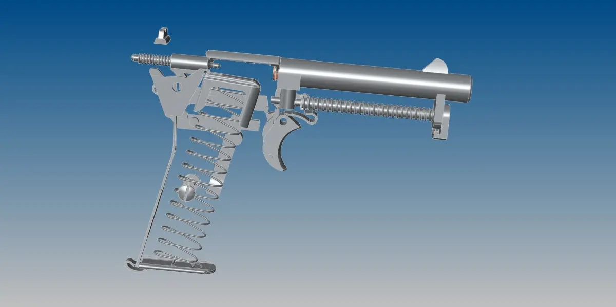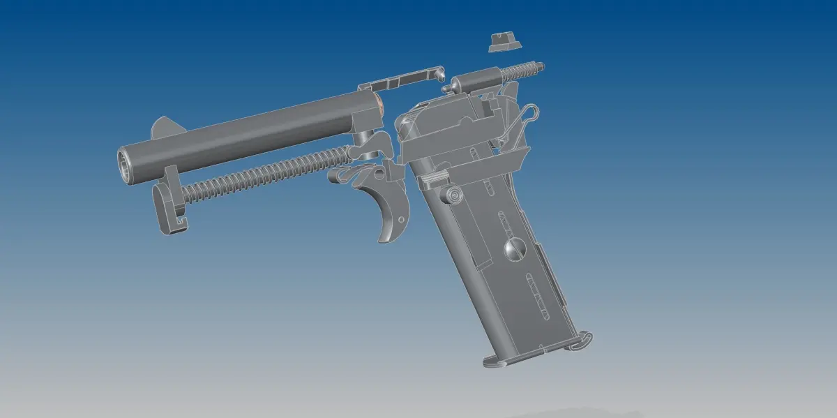 The first variant of the Model 1910 was the “Side Latch”, which featured a rotating side-latch just above the trigger which enabled the cover over the side of the lockwork to be removed for cleaning. The second variant was the “New Model” typically referred to as the “Model 1910/14” because it first appeared in 1914. The original side-latch model created some potential problems when field stripped as the trigger could be removed, but would be difficult to replace because of the spring pressure on it. The New Model eliminated this issue and provided some other changes to the lockwork including improvements to the interrupter mechanism, and the magazine and slide stop mechanisms. The New Model's change to the striker mechanism also made it easier to determine if the pistol was cocked.The pistol was single action, and striker fired, with the trigger connected to a bell crank lever which rotated around its center to disengage from the striker sear, allowing it to fly forward under spring pressure and discharge the cartridge