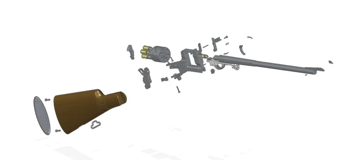 Full assembled model of Mauser Zig-Zag revolver-carbine and 10,6-mm Deutsche Ordonnanz bullet.