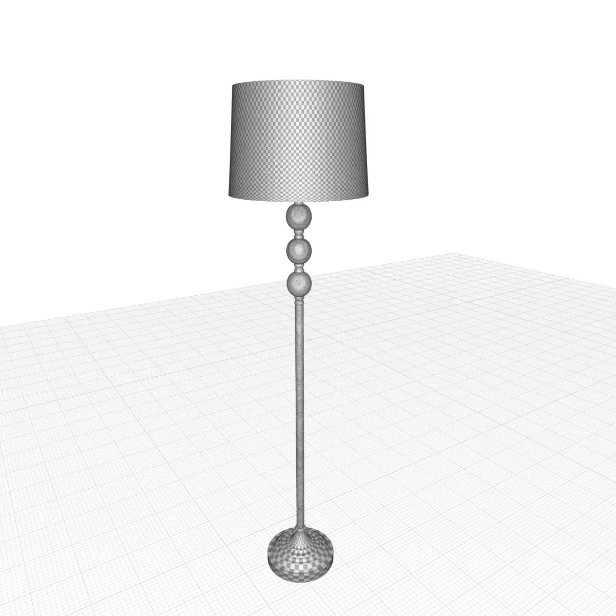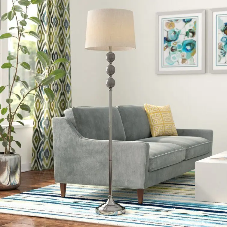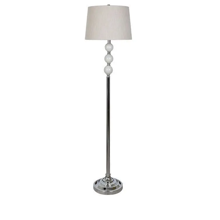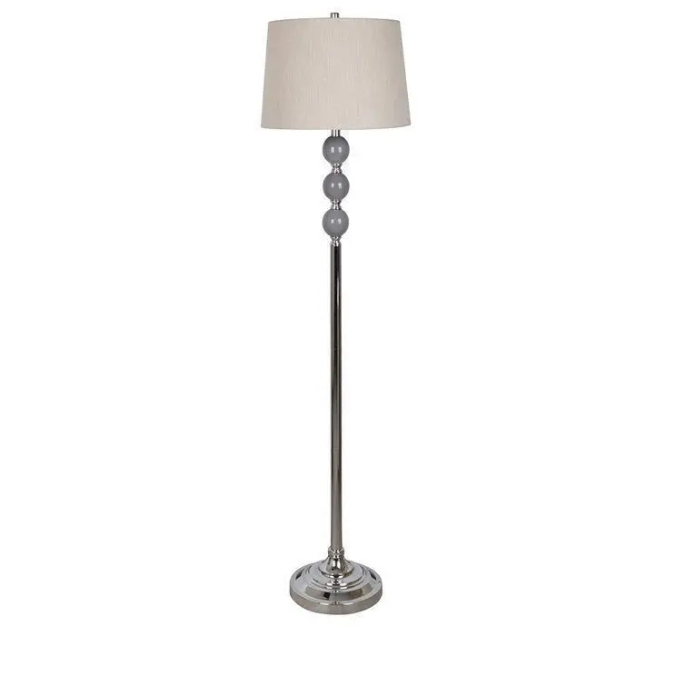 - This contemporary stylish Maximillian Floor Lamp in a chrome finish and 3 stacked ceramic grey orbs. The tapered drum shade has an oatmeal linen fabric.