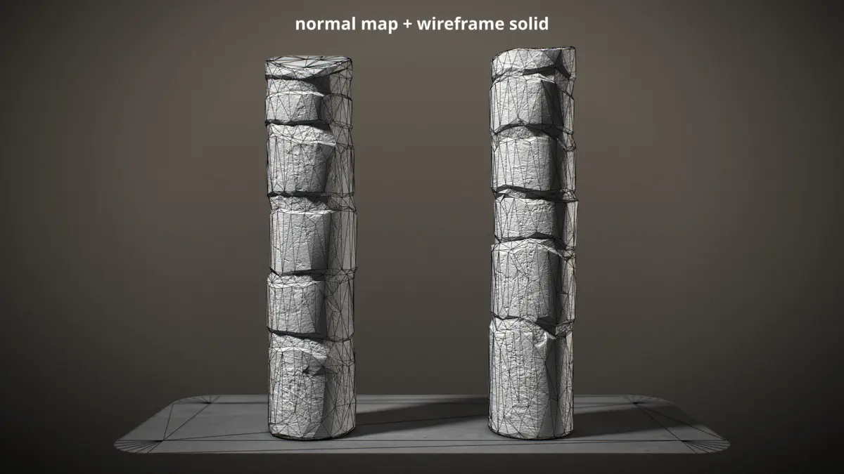 These are the specs:Two low poly columns with 622 points and 1240 polys each (3 vertex).4K textures (color, roughness, normal, displacement and ambient occlusion maps).Three 3D formats: DAE, LWO, FBX and OBJ (Lightwave 3D native with Octane materials ready). The LWO and OBJ formats have vertex normal smoothing.One UV per object.