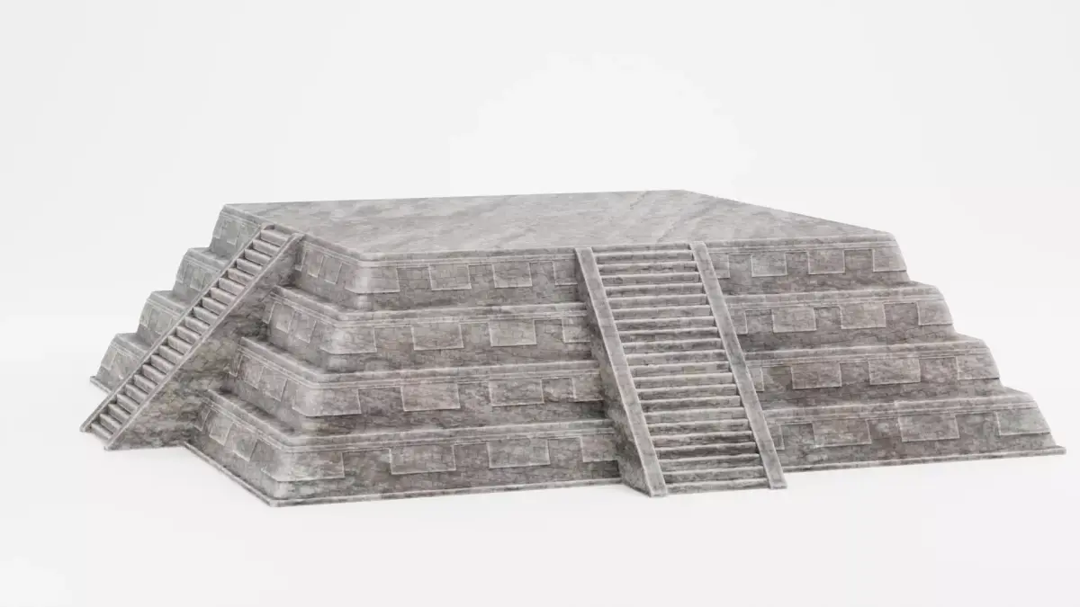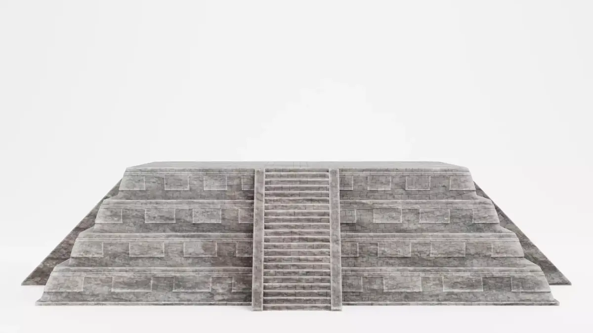 A stepped temple pyramid with a flat ceremonial platform on top, inspired by Mesoamerican architecture. The structure is defined by clear geometry and rhythmic steps, ending in an open platform that naturally suggests ritual, gathering, or architectural extension. The stone materials are balanced with gentle tonal variation that supports the form and scale of the structure. The model works naturally in historical environments, game levels, cinematic scenes, and large landscapes where architecture plays a central role.