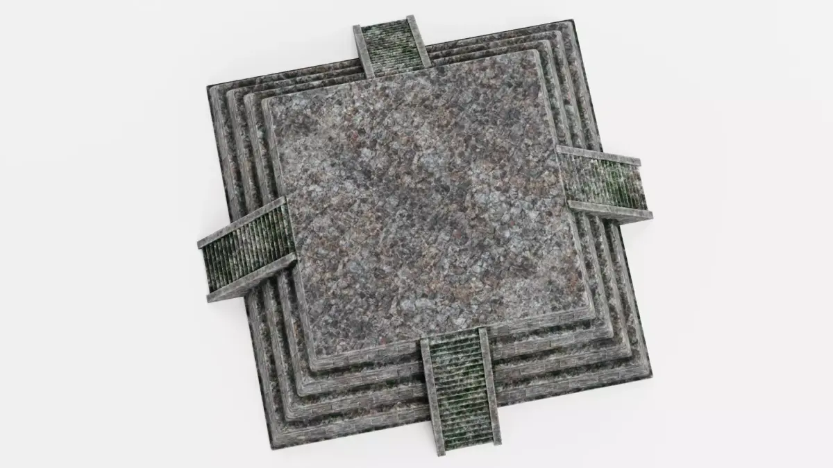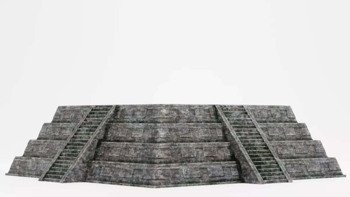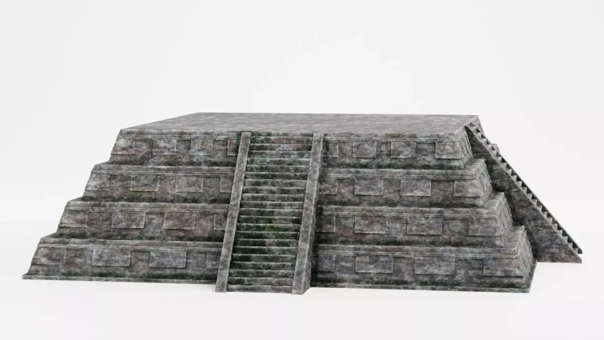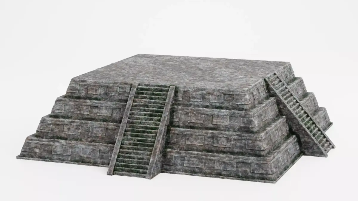 A stepped temple pyramid with a flat ceremonial platform on top, inspired by Mesoamerican architecture. The structure is defined by clear geometry and rhythmic steps, ending in an open platform that naturally suggests ritual, gathering, or architectural extension. The stone materials are balanced with gentle tonal variation and natural buildup that supports the form and scale of the structure. The model works naturally in historical environments, game levels, cinematic scenes, and large landscapes where architecture plays a central role.