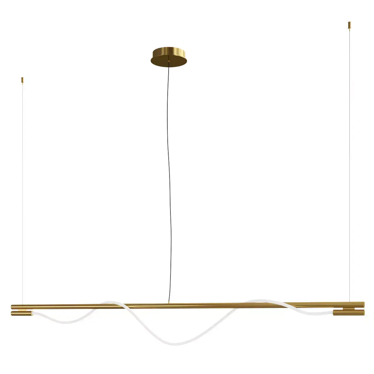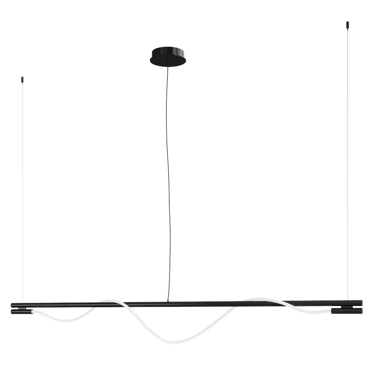 This is a high-quality 3D model of the Maytoni Tao MOD166PL-L20G3K pendant lamp, a bold and artistic linear lighting fixture. It is characterized by its playful yet elegant design, featuring a long, straight rod from which a fluid, wavy LED tube gracefully drapes. This model accurately captures the lamp's sculptural form and the striking contrast between the rigid metal bar and the organic, flowing lines of the light element.